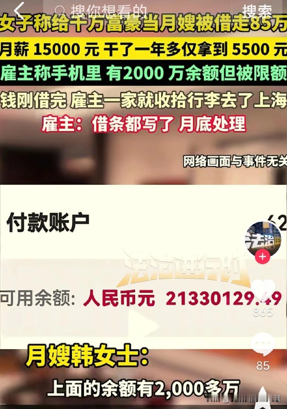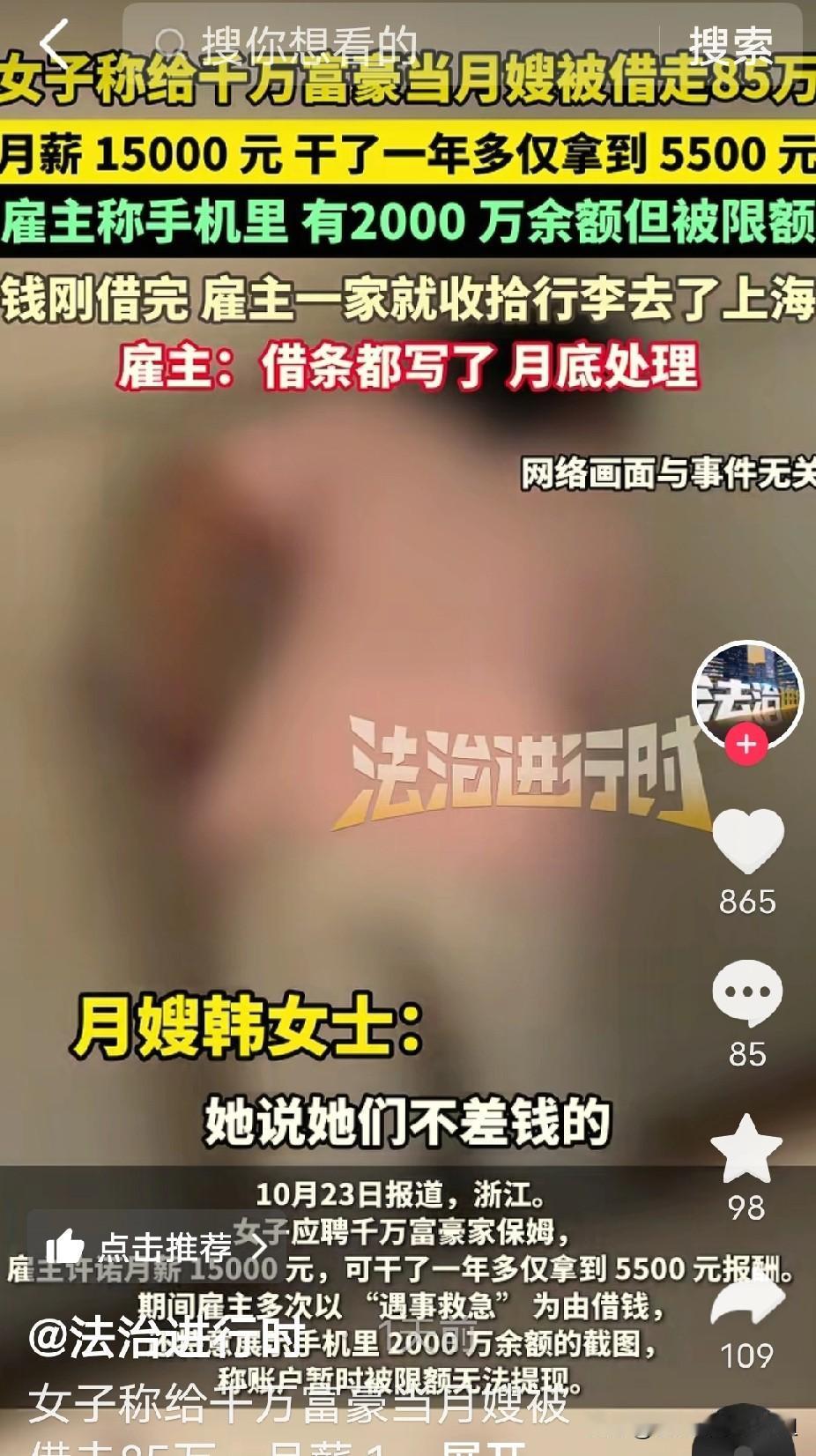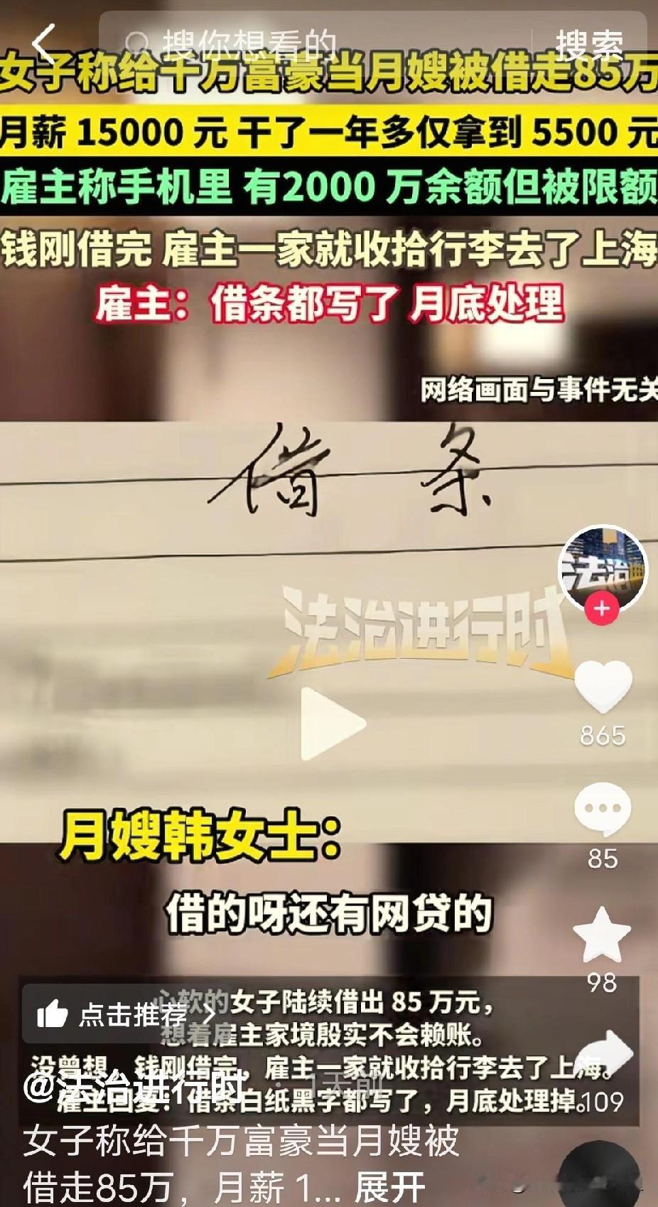 太可恨了,月嫂辛苦打工一年,没挣到钱还背上85万巨债 韩女士原本满心欢喜地以为找到了改变生活的好机会,月薪一万五的工作对她来说相当有吸引力。谁能想到这竟然是一场精心设计的骗局,雇主所谓的“千万富豪”身份全是伪装,连住的豪宅都是租来的。她不仅没拿到应得的工资,反而被卷入了债务漩涡,这种利用他人善良的行为实在令人愤慨。 刚开始雇主表现得特别大方,刚到岗就给了5500元“安家红包”,还展示了两千多万元的银行卡余额截图。这种炫富行为完全是为了博取信任的手段,等到该发工资的时候,雇主就开始演苦情戏,声称银行卡被冻结需要交保证金。最让人气愤的是他们专门针对月嫂的善良心理,一口一个“韩姐”地叫,让韩女士觉得不帮忙都过意不去。 积蓄被骗光后,雇主竟然变本加厉地诱导韩女士去借网贷,甚至编造卖路虎需要过户费的谎言,又骗走了十几万。这种一步步将人拖入深渊的手法极其恶劣,等韩女士再也拿不出钱,这家人直接卷铺盖跑路了。 月嫂这份工作本身就非常辛苦,需要熬夜照顾宝宝和宝妈,承受着巨大的身体和心理压力。像韩女士这样的月嫂往往来自普通家庭,有的甚至背负着债务,指望通过这份工作改善生活。结果非但没有赚到钱,反而背上沉重债务,这种打击是毁灭性的。 更令人担忧的是,月嫂行业缺乏足够保障,很多月嫂与雇主或中介之间只是劳务关系,一旦发生纠纷,维权会非常困难。类似韩女士的遭遇并非个例,有的月嫂甚至干了活根本拿不到工资。 这个案例给所有打工人敲响了警钟:雇佣关系里谈钱必须守底线。真正的有钱人绝不会向收入远低于自己的服务人员频繁借钱,更不会诱导员工借网贷救急。家政从业者一定要通过正规平台接单,坚决拒绝雇主的任何金钱借贷要求。 签订正规合同非常重要,明确工资支付时间和方式。遇到雇主屡次以各种理由拖欠工资并试图借钱的情况,必须果断停止借款并考虑报警。记住任何看似高回报的机会都可能隐藏着陷阱,需要保持清醒头脑。 韩女士的案件目前还在处理中,虽然对方写了欠条,但能否兑现仍是未知数。我们希望法律能给韩女士一个公正的结果,同时也提醒所有劳动者提高警惕,保护自己的合法权益。 各位读者你们怎么看?欢迎在评论区讨论。