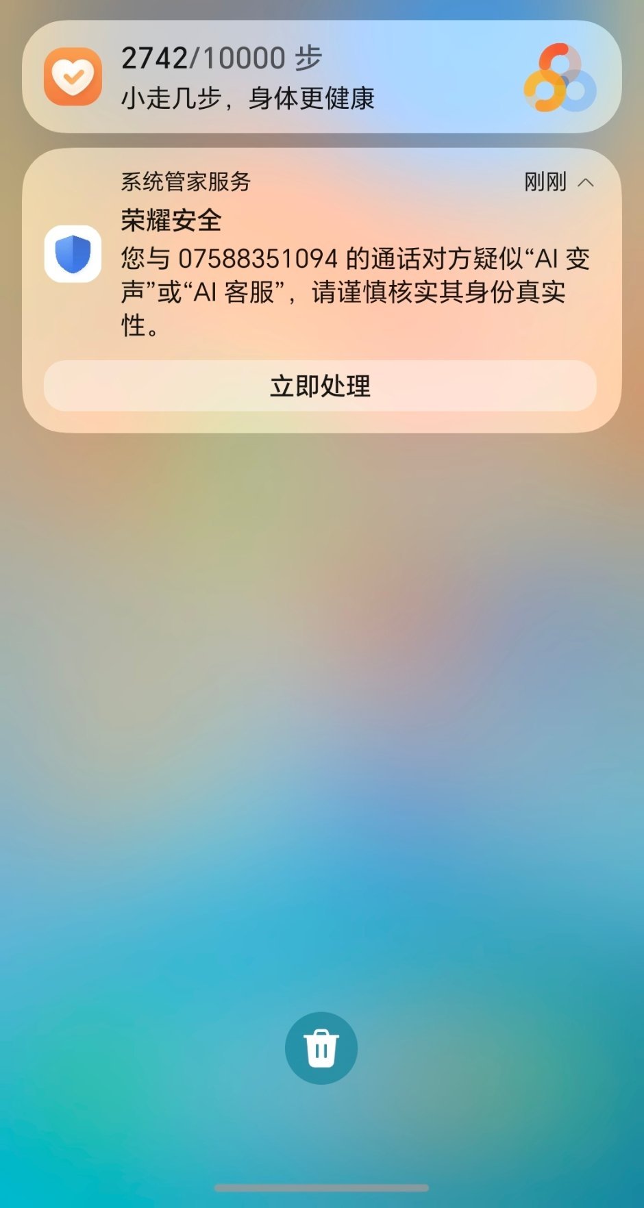 荣耀MagicOS 10的AI通话反诈真实用,今天接电话过程中就提醒我对方是AI变声或AI客服,让我注意防范。