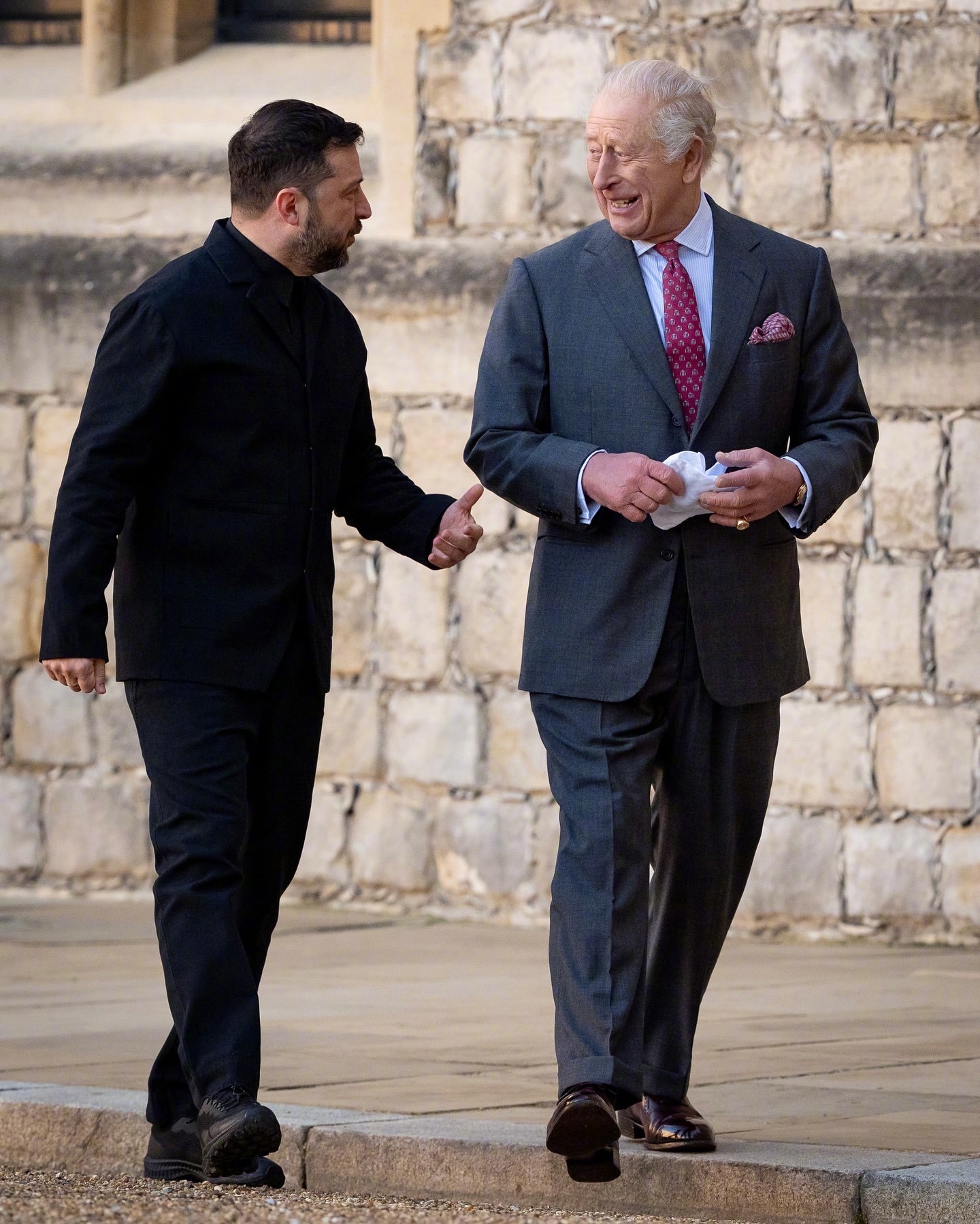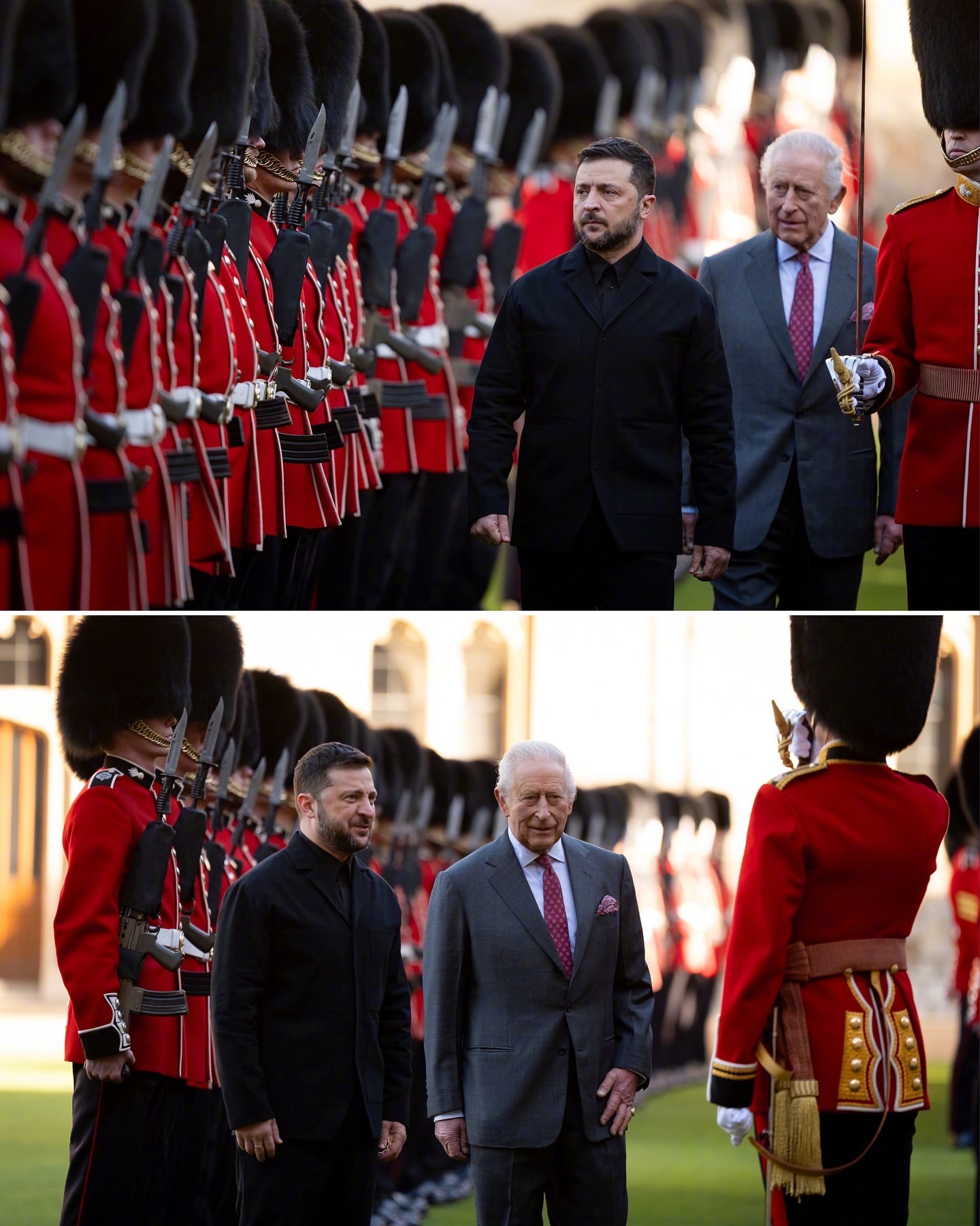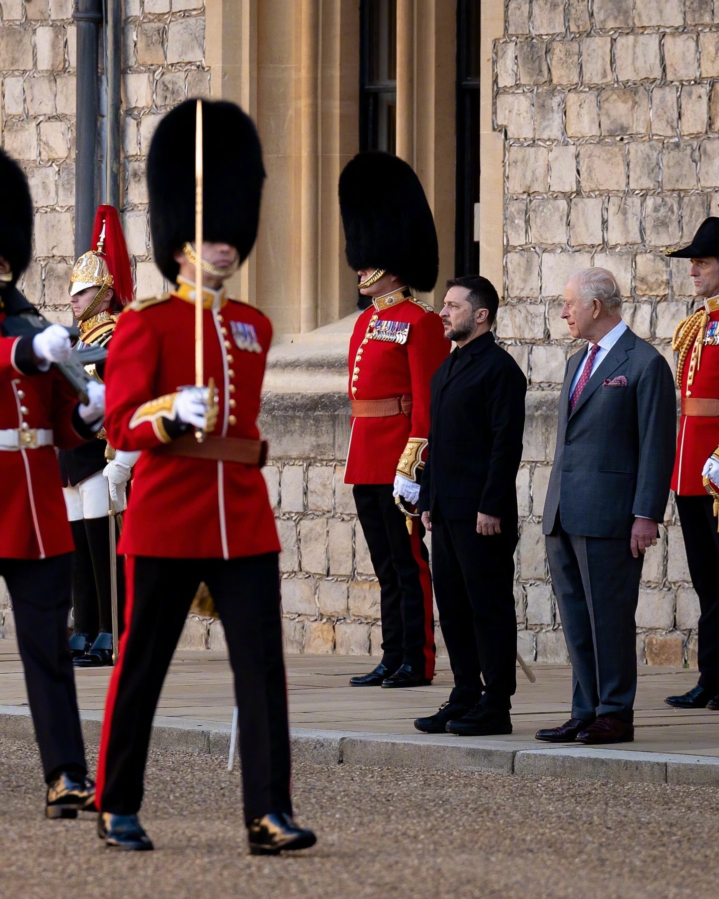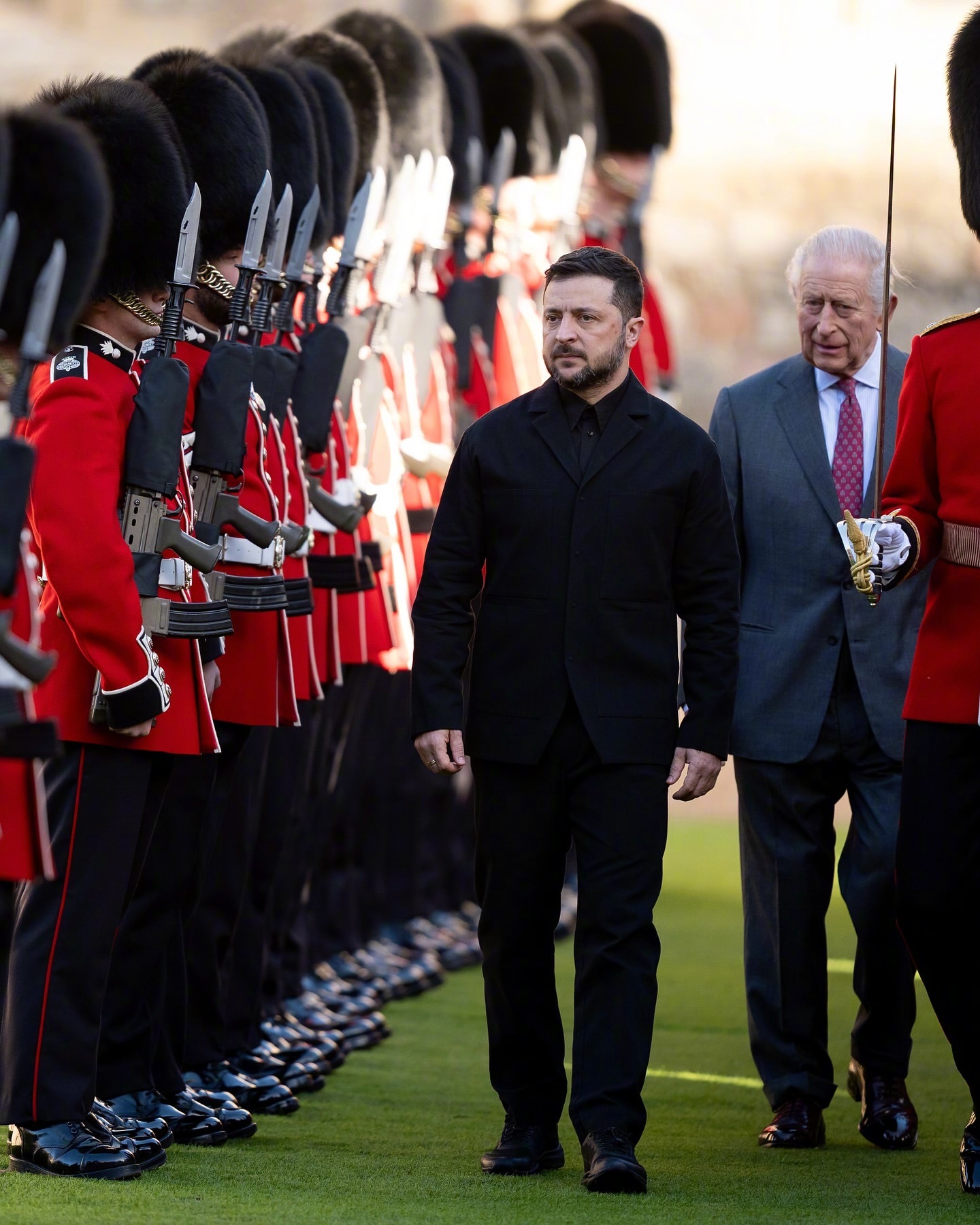 早晨,英国国王在温莎城堡接见了乌克兰总统弗拉基米尔·泽连斯基。泽连斯基总统抵达四方庭后,受到了皇家礼仪的欢迎,随后被邀请检阅卫队。