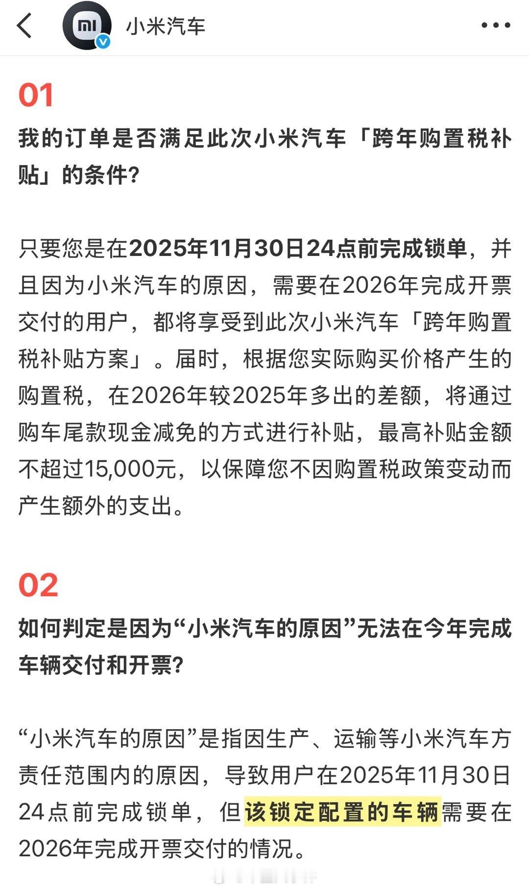 关于“小米汽车原因”的判定标准,官方也给出具体界定:仅包含因生产进度、物流运输等小米汽车责任范围内的问题,导致已锁单用户需在2026年完成开票交付的情况,确保补贴判定透明可依。 小米汽车公布跨年购置税补贴方案