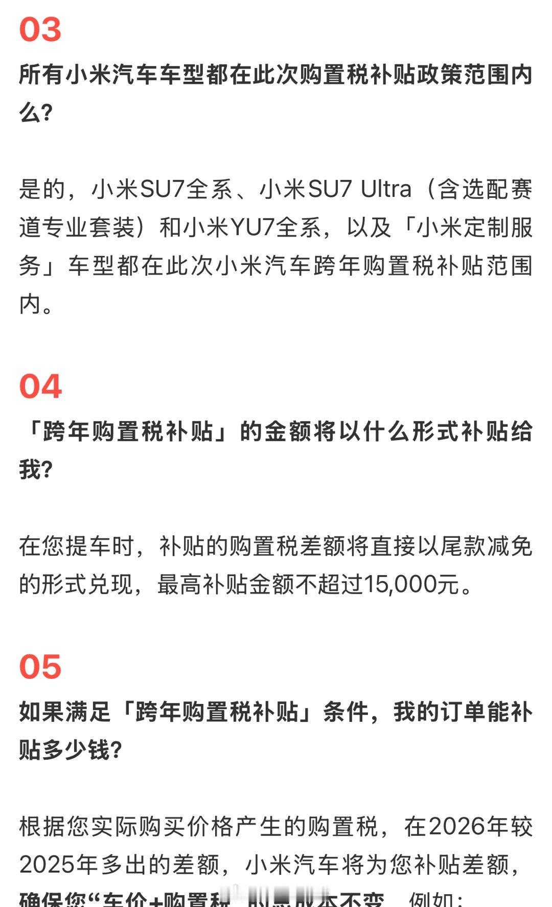 小米汽车解答购置税补贴方案问题 10月24日晚,就跨年购置税补贴相关问题作出正式回应,清晰划定补贴适用范围与责任判定边界。