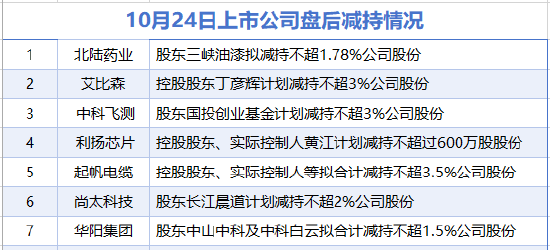 据统计,10月24日,盘后北陆药业、艾比森、中科飞测、利扬芯片、起帆电缆、尚太科技、华阳集团等7家A股上市公司披露减持情况。当日暂无上市公司披露增持情况。