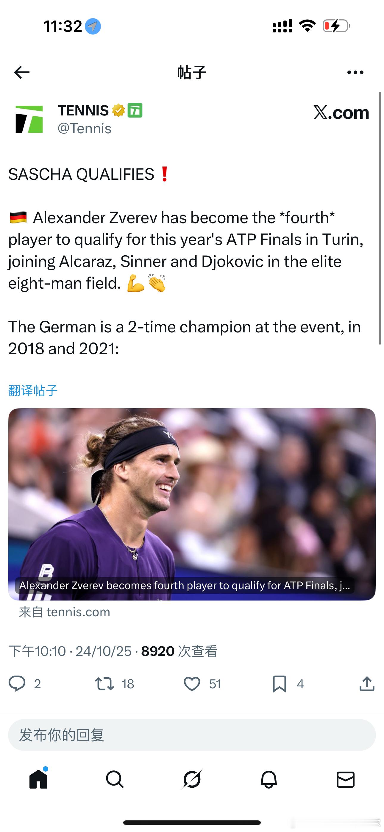 🇩🇪亚历山大·兹维列夫成为第四位晋级今年都灵ATP年终总决赛的球员,与阿尔卡拉斯、辛纳和德约科维奇一起跻身八强。 💪👏