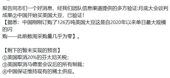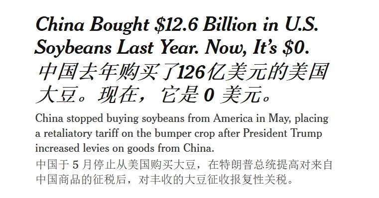 中国买了126万吨美国大豆?谣言! 最近网络上又出现一则传闻,说中美已经达成协议,中国不久前刚刚购买了126万吨美国大豆,号称是“2020年以来单日最大的闪购”。 那么这则消息的真实性如何呢? 事实上,这是一个谣言。所谓的“中国购买美国126万吨大豆”,信源实则是9月25日《纽约时报》的一则报道,但需要注意,《纽约时报》的原文是:“去年中国购买了126亿美元的美国大豆,如今这个数字变成了零”(图4)。 《纽约时报》写得清清楚楚,这笔采购交易发生在去年,而且是126亿美元的大豆,不是126万吨。 截至目前,最热衷于爆料白宫内幕的消息《华尔街日报》、美国有线电视新闻网、《华盛顿邮报》和《纽约时报》,均未发布确切报道证实中国恢复美国大豆采购。 反之,这条谣言目前仅在中文网络上大范围流传,特别是在加密货币的交易社区,以及某些经济、财经人士的朋友圈中,有不少人都信誓旦旦地保证自己拿到了内幕消息,可一问起他们的内幕是从哪来的,一个个都开始装聋作哑,要么转移话题。 某些别有用心的人连造谣都造得这么拙劣,简直可笑。
