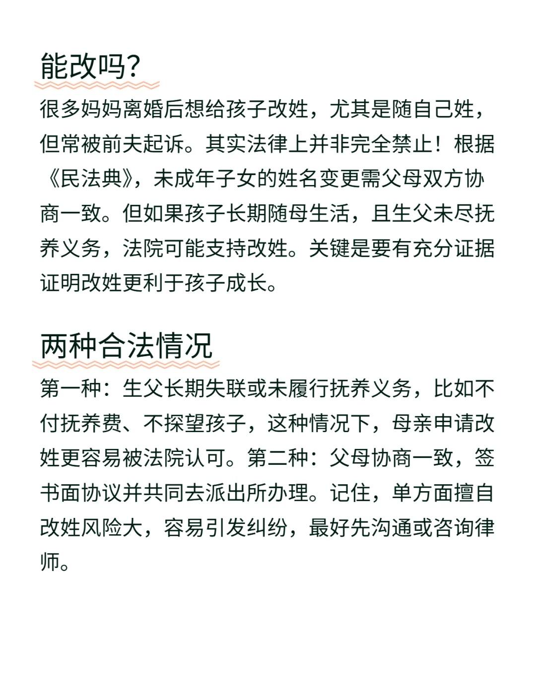 给孩子改名后,被前夫起诉了? [害羞]能改吗? 很多妈妈离婚后想给孩子改姓,尤其是随自己姓但常被前夫起诉。其实法律上并非完全禁止!根据《民法典》,未成年子女的姓名变更需父母双方协商一致。但如果孩子长期随母生活,且生父未尽抚养义务,法院可能支持改姓。关键是要有充分证据证明改姓更利于孩子成长。 [偷笑]两种合法情况 第一种:生父长期失联或未履行抚养义务,比如不付抚养费、不探望孩子,这种情况下,母亲申请改姓更容易被法院认可。第二种:父母协商一致,签书面协议并共同去派出所办理。记住,单方面擅自改姓风险大,容易引发纠纷,最好先沟通或咨询律师。 程序怎么走? 想合法改姓,得去户籍所在地派出所申请。需要材料包括:出生证明、户口本、离婚协议或判决书父母身份证,以及双方签字的同意书。如果是单方申请,还得提交对方失联或不履职的证据,比如聊天记录、转账记录等,材料越全成功率越高。 [机智]会被判赔偿吗? 有人担心改姓会被前夫告上法庭赔钱。确实有案例,法院判过赔偿精神损失费,理由是侵犯了父亲的监护权。但如果能证明改姓是出于孩子利益,比如避免骚扰、保护隐私或重建生活,法院也可能驳回索赔。提前走正规流程,能大大降低风险。 [惊喜]孩子意见重要 8周岁以上的孩子,法律尊重他们的真实意愿!如果孩子明确表示愿意跟妈妈姓,这会成为法院考量的重要因素。建议在沟通时保留录音或书面陈述(如孩子手写信),作为辅助证据。别让孩子卷入大人矛盾,但他们的声音值得被听见。 律师建议 作为律师提醒:别冲动改姓!先评估情况,收集证据,必要时走调解或诉讼程序确认变更权。如果对方不同意,可先尝试协商补偿或其他条件换取同意。专业的事交给专业的人,提前咨询律师,花几百块咨询费,可能省下几万块赔偿和一场官司。珠海芙蓉律师事务所 法律咨询 婚姻家事 改名字后续 起诉状 抚养权 用法律武器保护自己 改名字