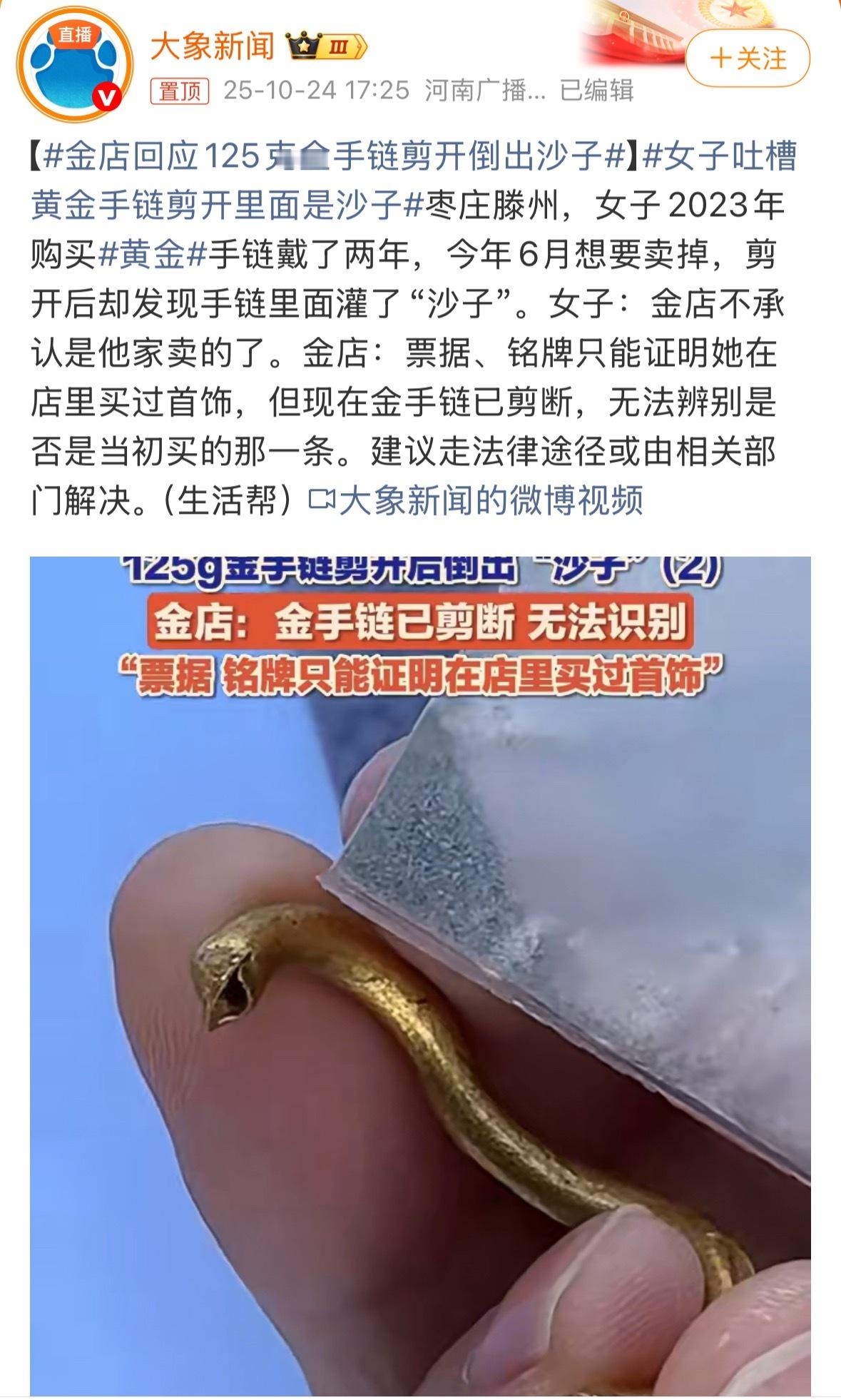 这个店的店员不是说货不是我们家买的,而是说他已经无法证明是在他们家买的,品一品其中的奥义。金店回应125克金手链剪开倒出沙子