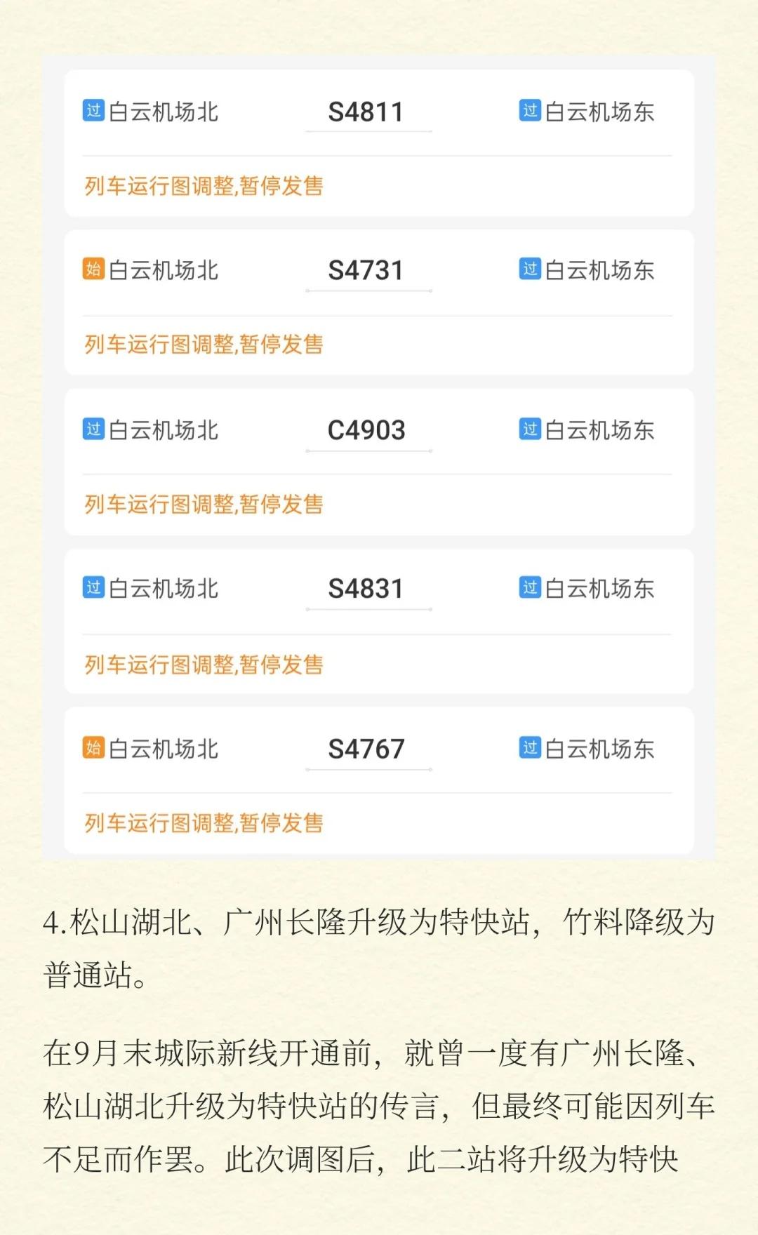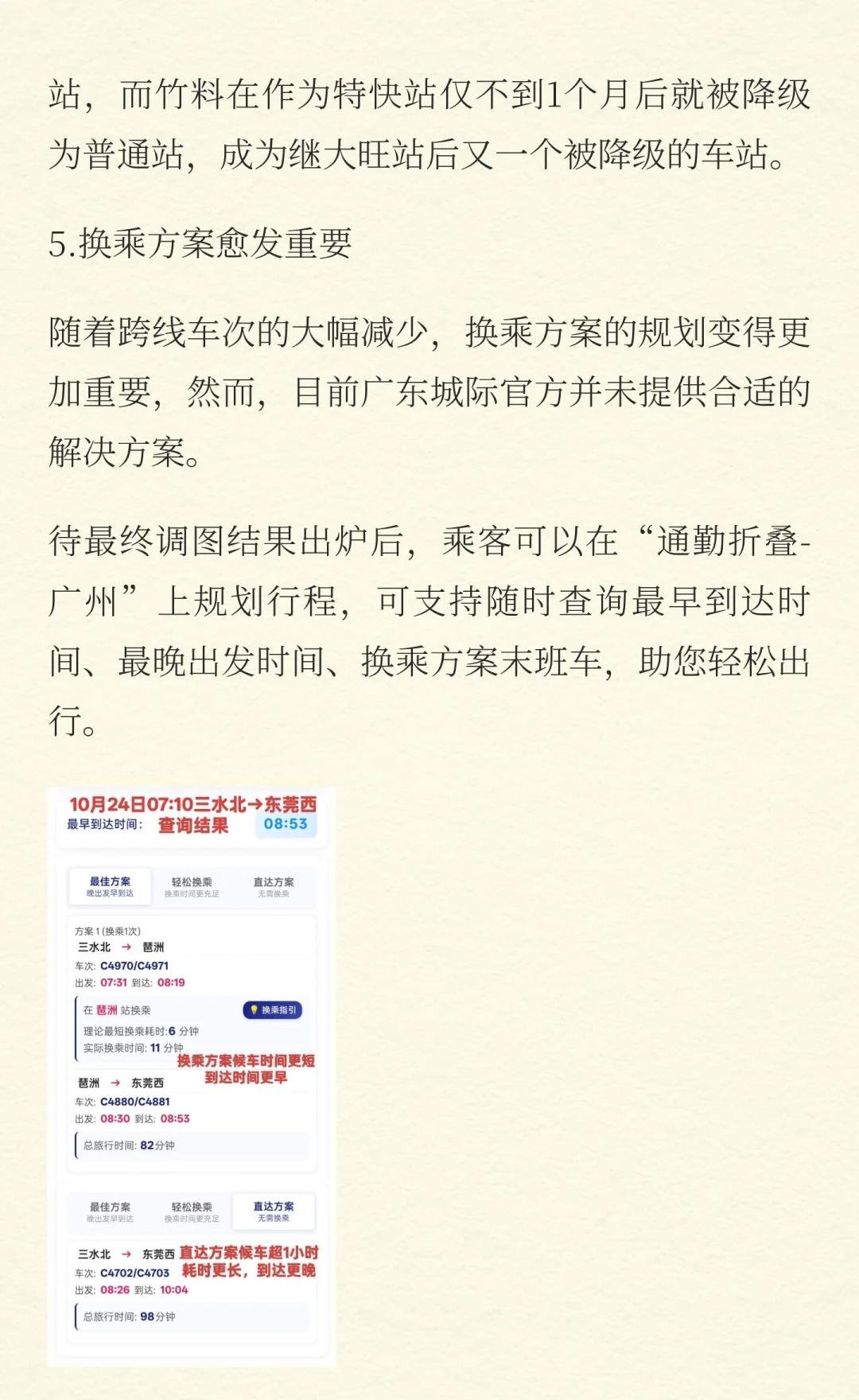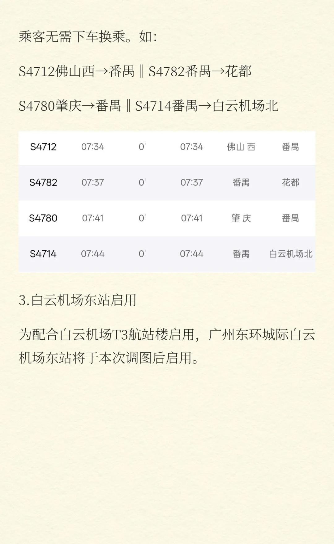 1025广东城际调图亮点抢先看,番禺站同车换 1.广惠城际车次加密。 2.跨线车次减少,肇庆至花都/白云机场北可同车换乘。 3.白云机场东站启用。 4.松山湖北、广州长隆升级为特快站,竹料降级为普通站。 5.换乘方案规划变得更加重要,可使用“通勤折叠-广州”查询行程。 12306 轨道交通 出行交通方式 广东城际 广州地铁 交通 出行攻略 通勤 广州