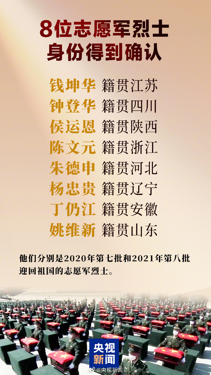 【致敬!#又有8位志愿军烈士身份确认#:其中有1位安徽英雄】记者从退役军人事务部了解到,在韩中国人民志愿军烈士遗骸鉴定工作有了新进展,8位志愿军烈士身份得到确认。8位烈士分别为钱坤华、钟登华、侯运恩、陈文元、朱德申、杨忠贵、丁仍江、姚维新,他们是2020年第七批和2021年第八批迎回祖国的志愿军烈士。
