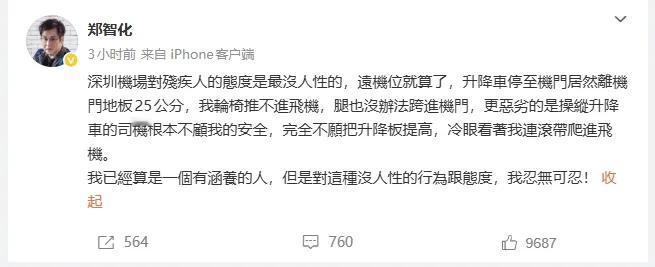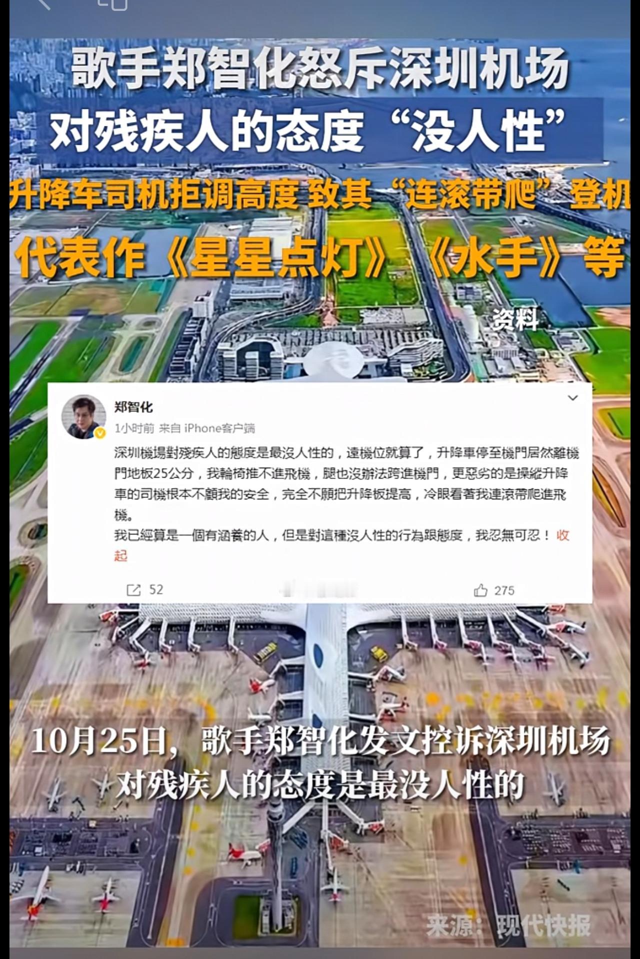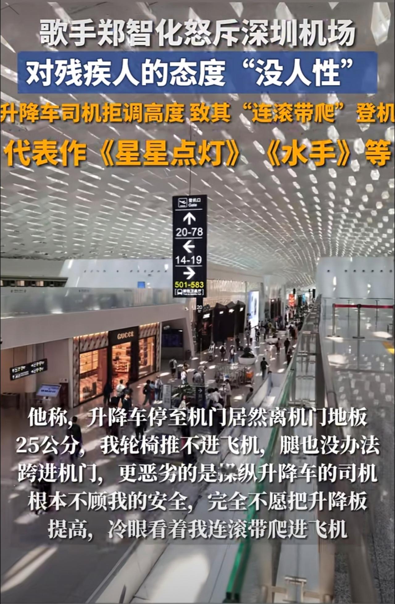 歌手郑智化发文吐槽“深圳机场没人性” 升降车司机拒调高度 致其“连滚带爬”登机。