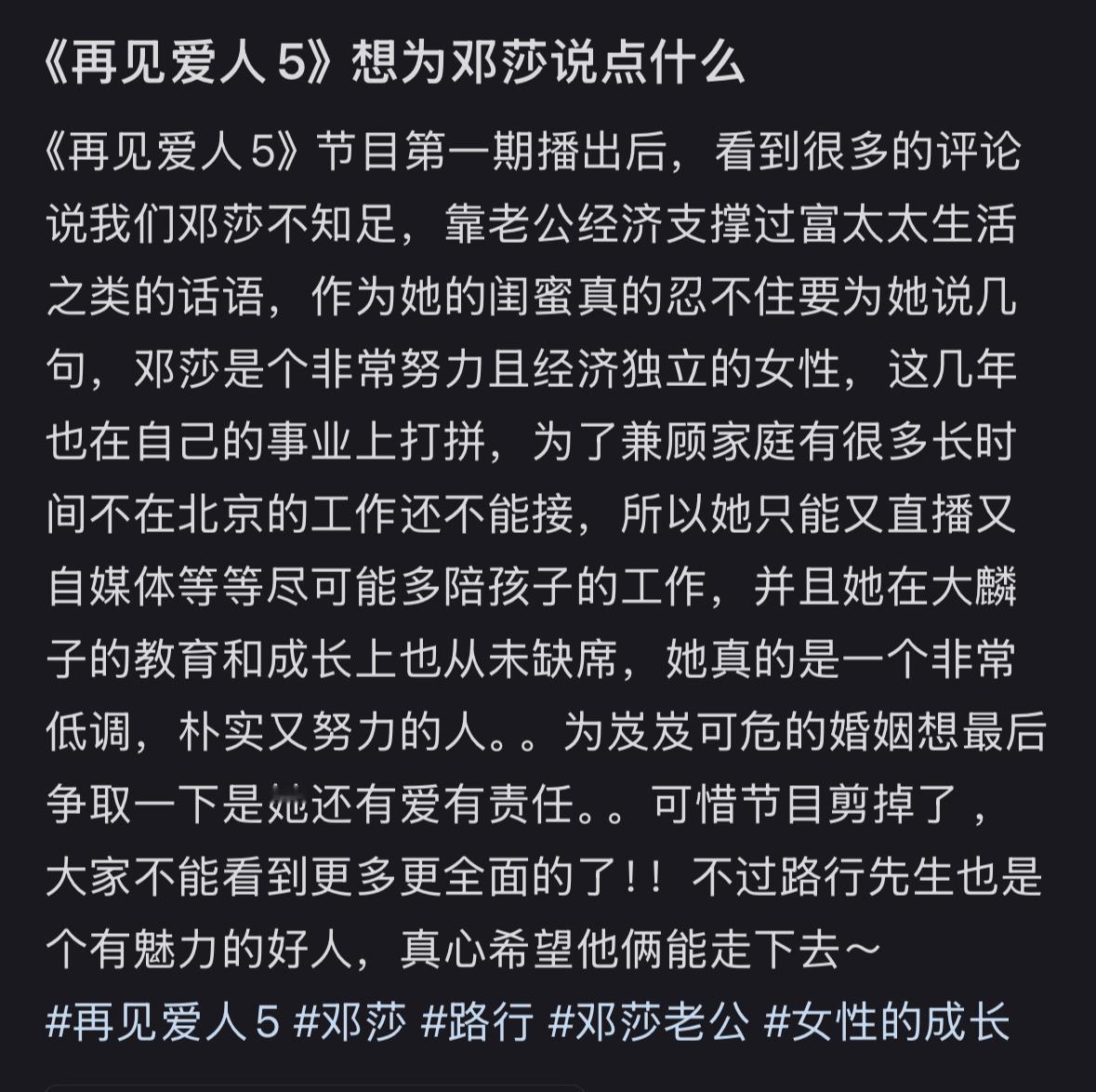 邓莎闺蜜为邓莎抱屈:她只想为岌岌可危的婚姻最后争取下,还表示邓莎非常努力且经济独立。 作为邓莎闺蜜,其看着邓莎恋爱结婚生子,透露邓莎本人非常重情义,低调朴实有责任心。 为了更多照顾孩子,邓莎放弃了很多离家太远的工作,为了补足这一部分的放弃,她开始直播做自媒体,希望有更多的途径发展事业。 对于路行,邓莎闺蜜坦言是个“有魅力的好人”。只可惜,路行因现因个人原因退出《再见爱人》,镜头全剪,观众更难窥见二人的婚姻全貌了。