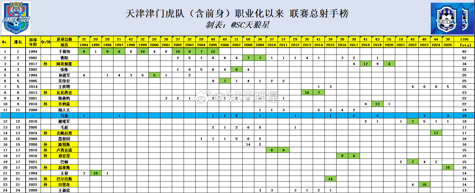 3. 谢维军代表球队总进球数,达到24球(联赛18+足协杯6),目前升至历史总射手榜前10,和瓦伦西亚与乔纳森并列第9位(图3)