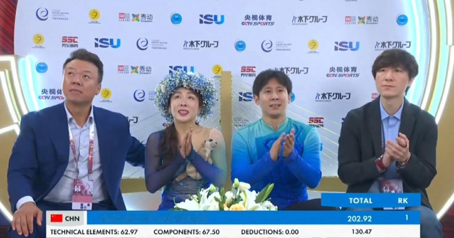 中国杯世界花滑大奖赛,双人自由滑,时隔三年重返国际赛场的中国组合隋文静/韩聪以一曲《只此青绿》,获得130.47分,总成绩为202.92分,最终摘得铜牌!