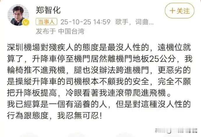 郑智化在深圳机场的遭遇,说明了3个事: 1. 机场设施不到位,细节工作没做好。升降车和机舱门之间的距离,轮椅没法推进去,无障碍设施成了摆设。 2. 服务人员态度冷漠,冷眼旁观,完全没有主动助人的意识。 3. 培训不到位,这事发生了,机场才说要加强员工培训,说明平时的培训肯定有漏洞。 4.缺乏对特殊人员的照顾,机场来来往往那么多人,什么样的人都有,老弱病残没有专门专项服务。 愿加强管理,毕竟文明社会,不该让任何人“连滚带爬”地生活。[心]