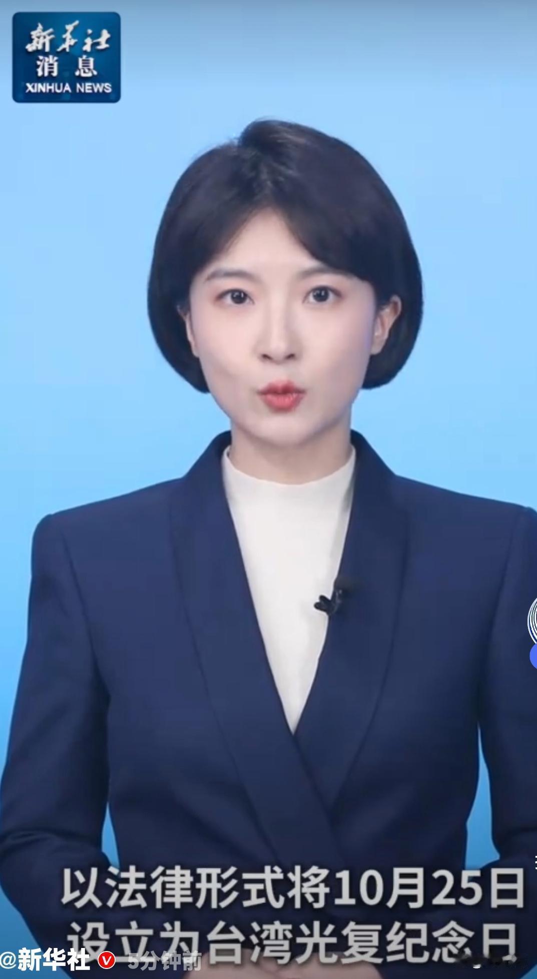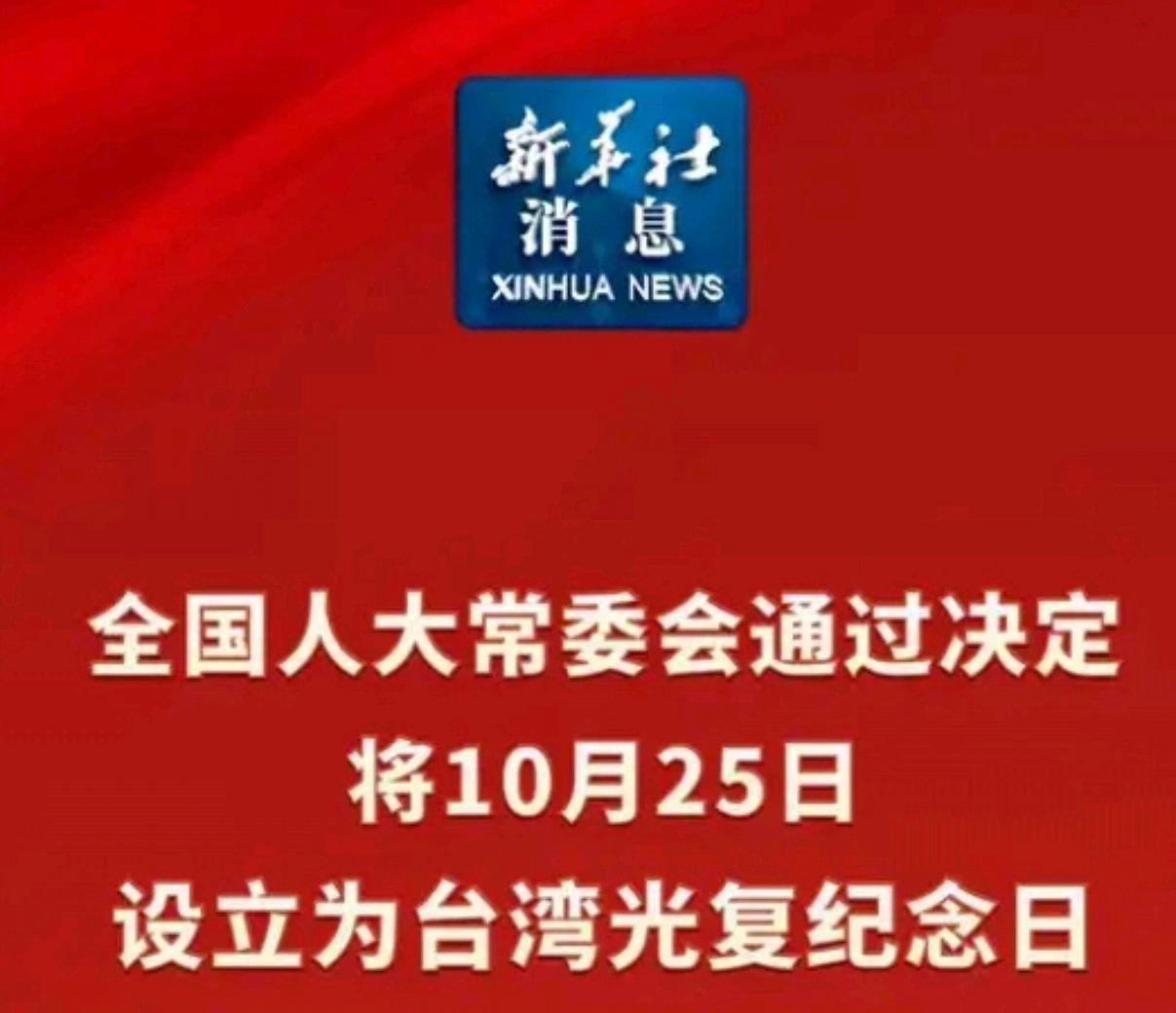 10月26日,据央视新闻报道!10月24日,全国人大常委会第十八次会议经过表决,通过了设立台湾光复纪念日的决定,以法律形式将10月25日设立为台湾光复纪念日,并且通过国家多种形式举行纪念活动。 1945年10月25日,中国🇨🇳战区在台湾省受降仪式,在台子E举行,至此台湾、澎湖列岛重归中国🇨🇳主权管亡下。 为什么此时此刻全国人大公布台湾光复纪念日? 一是对台湾赖清德否认台湾光复事实的有力回击,以国家层面确认台湾光复这一事实。 二是同时回击一域外国家颠倒黑白,否认这段历史,正告他们否认台湾光复是痴心妄想。 三是,从某种层面上讲,只要台湾统一了,澎湖列岛也就自然而然的成为中国🇨🇳一部分,1945年在台湾受降仪式上明确规定台湾、澎湖列岛重归中国🇨🇳主权管车官。 相信这一天不会太远了,台湾问题因民族弱乱而产生,也因民族复兴而终结。
