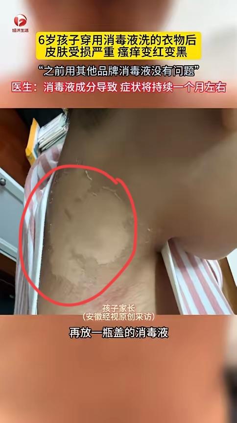 深圳家长给娃洗衣太“拼”!加1瓶盖消毒液想杀菌,结果成“皮肤刺客”。 6岁娃穿了这衣服,先痒后蜕皮,皮肤遭腐蚀,医生说要1个月才好。家长换了消毒液品牌没在意,娃痒时还以为是过敏,直到皮肤又红又黑才慌了神送医。 网友吵翻,有人说不用消毒液,有人猜娃可能有皮肤病。其实娃皮肤嫩得像薄纸,哪经得住化学刺激? 想给娃搭“保护罩”,反倒踩了坑。日常洗衣清水晒晒太阳就够,真没必要瞎折腾!