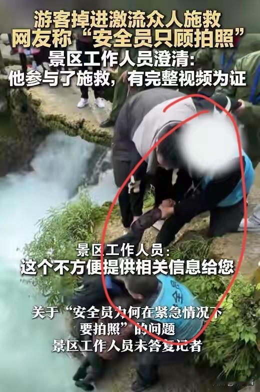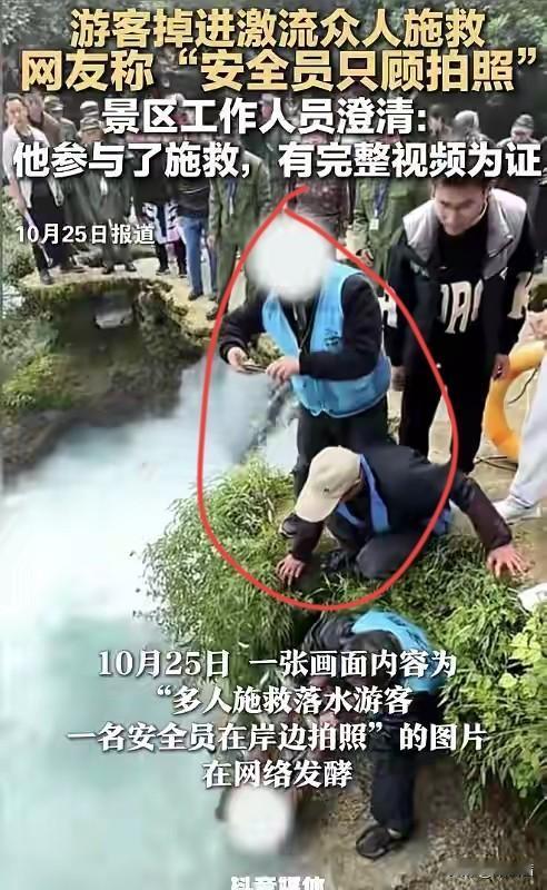 现在的网络键盘侠真的是越来越多,就在最近贵州景区一名游客落水,有人把视频拍下发到网上,就有网友说安全员“岸边拍照不救人” 事情发生在贵州荔波县小七孔景区,游客落水、多人施救的画面在网上传开,有网友盯着图片里的一名安全员,说他只顾在岸边拍照,压根没动手救人,这话一出立马引发热议 事情发生在10月24号,当时有游客在景区落水,周围不少人都伸手帮忙,有人把这一幕拍了下来,传到网上后,就有声音指向其中一位安全员,觉得他在紧急关头不参与救援,反而拿着东西拍照,有点不负责任。 后来有记者专门去核实,景区工作人员赶紧解释,说涉事的安全员根本不是网传的“不施救”,还建议记者看完整的救援视频。从记者拿到的视频里能清楚看到,这位安全员其实全程参与了救援,比如他把营救用的梯子放进急流里,还伸手抓住施救者,帮忙把人拉上了岸,并不是像图片里看起来那样只站着不动。 不过大家最关心的还是,既然安全员在救人,那为啥会有“拍照”的动作?面对记者追问“紧急情况下为啥要拍照”,景区工作人员没给出明确答复,这也让不少网友心里还留着疑问。 其实网上传消息常这样,一张截图、一个片段很容易让人误会,好在这次有完整视频能还原部分真相。但景区没说清“拍照”的原因,还是让大家有点不理解。大家觉得,遇到紧急救援时,工作人员记录现场和参与救援该怎么平衡呢?