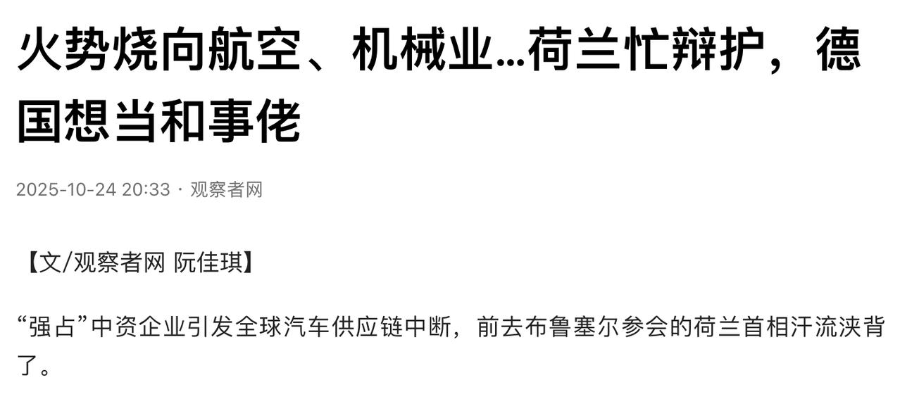 想不到吧?堂堂一国首相,竟然可以如此不顾体面! 十月初,全球几大汽车品牌都接到同样一封信,内容只有短短几行:芯片供应可能中断。日本、德国、美国的工厂负责人几乎在同一时间陷入慌乱。 发出通知的是荷兰的安世半导体,这家生产汽车核心芯片的供应商突然出了问题,整个行业瞬间紧张起来。 没过多久,荷兰首相斯霍夫在欧盟峰会前被记者堵住。他的解释让所有人意外“公司管理出了问题”,于是政府不得不介入。 这听起来像是在撇清责任,但事实摆在那,他口中的“问题”,其实是荷兰政府自己引爆的。 就在不久前,他们动用了冷战时期的应急法案,强行接管了安世半导体,直接罢免中国籍的CEO张学政。 这家企业原本经营得好好的,被突然接管,让人不禁怀疑背后另有原因。 安世半导体的重要性不言而喻。这家公司生产的芯片几乎装进了全球每一辆汽车,从灯光控制到安全气囊,全离不开它。 更值得注意的是,2019年它临近破产时,是中国的闻泰科技花大价钱把它收购下来,才让它起死回生。经过几年经营,公司盈利能力恢复,2024年的账面数据相当亮眼。 但就在企业走上正轨时,荷兰政府突然宣称要防止“技术外流”,打着国家安全的旗号进行接管,这显然说不通。 事实上,早在六月,美国官员就私下向荷兰政府施压,要求撤换公司管理层,否则要把安世列入实体清单。荷兰这番操作,看似独立决策,其实受人指挥。 中国方面的反应非常果断。10月4日,中国宣布限制安世中国工厂的芯片出口,这可不是一句口头威胁。 安世中国团队随即宣布独立运营,人事、薪酬、订单都不再听命荷兰总部,还把结算方式改成了人民币。这一系列动作,等于直接让荷兰政府失去了对公司的实质控制权。 接着,问题越滚越大。德国的汽车产业首当其冲,他们急得直开危机会议,想充当中间人。日本车企也坐不住了,表示芯片认证周期太长,短时间内根本找不到替代供应。 美国更慌,因为自家车厂同样仰赖安世的产能。全球车市被这一场政治操作搅得天翻地覆。 眼看着局势失控,荷兰政府这才意识到事态的严重。荷兰经济大臣赶紧找中国商谈,希望能缓和局势,但主动权早已不在他们手上。 中国明确表示,荷兰的举动已经破坏了整个供应链的安全。与此同时,闻泰科技正式提起仲裁,要求荷兰赔偿25亿欧元,欧洲车企也准备追责。 此时,斯霍夫依旧在公开场合强调“欧洲太脆弱”,试图把责任转移到供应链本身。但全球产业界早已看得明白,这不是供应链有问题,而是政客让市场变成了人质。 荷兰想通过接管来掌控技术,却忽略了企业赖以生存的命脉不在办公室里,而在工厂、市场和合作伙伴之间。 如今,被接管的安世荷兰总部形同空壳,而安世中国仍然运转正常,继续给客户供货。荷兰当局陷入了两难,既不敢公开退让,又无法继续强硬。 供应链是一张紧紧相扣的网,没有任何一个国家可以轻易拽断。荷兰以为掌握了控制权,却忽略了规则与信任才是国际合作的基础。 现在的困境,就像一面镜子,照出了他们决策中的短视与僵硬。全球化不是靠行政命令维系的,更不是靠甩锅能挽回的。 倘若荷兰仍执意固守错误,那失去的将不仅是市场,更是未来很长一段时间内的信誉与信任。