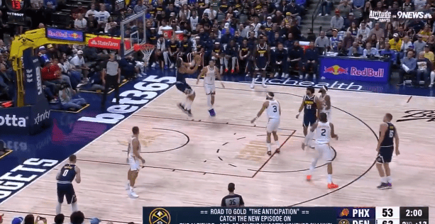 第二节比赛,约基奇弧顶高抛助攻,戈登起飞360°转身空接暴扣。