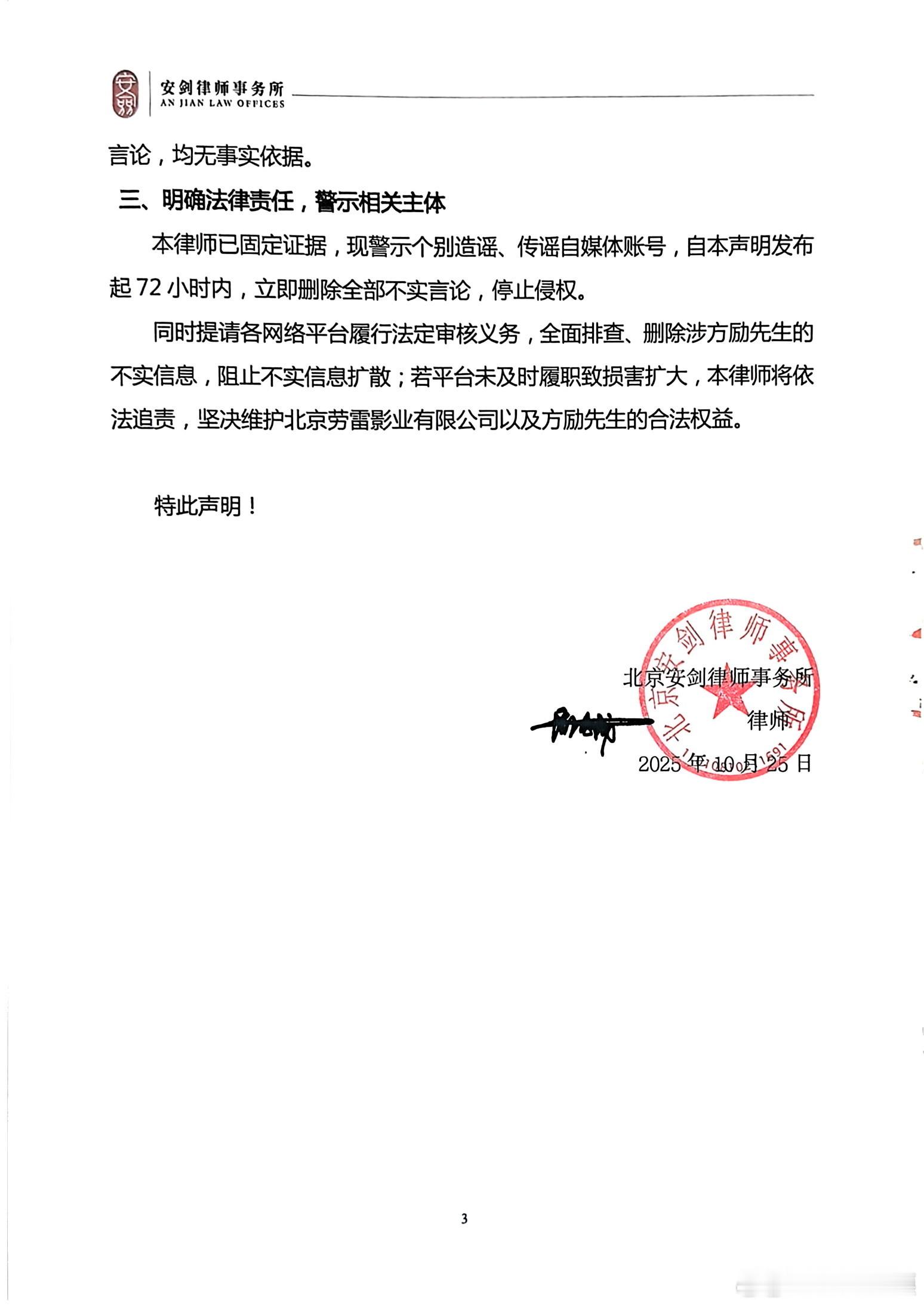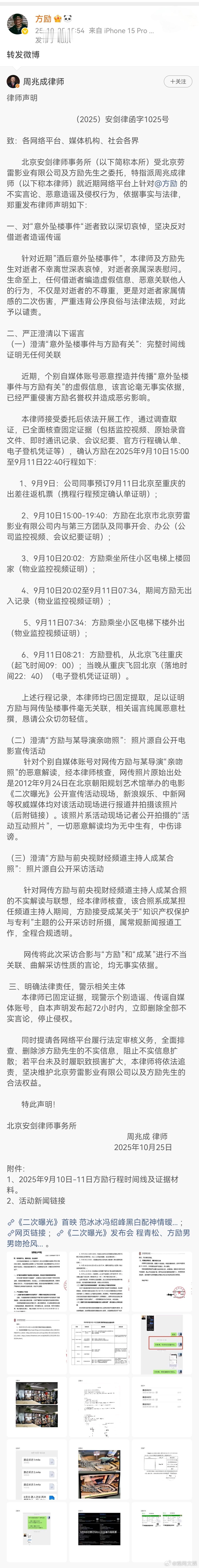 方励发完整行程时间线回应传闻方励发律师声明辟谣10月25日,导演转发委托律师声明,声明称个别自媒体账号恶意捏造并传播“意外坠楼事件与方励有关”的虚假信息,该言论毫无事实依据,已经严重侵害方励名誉权并造成恶劣影响。