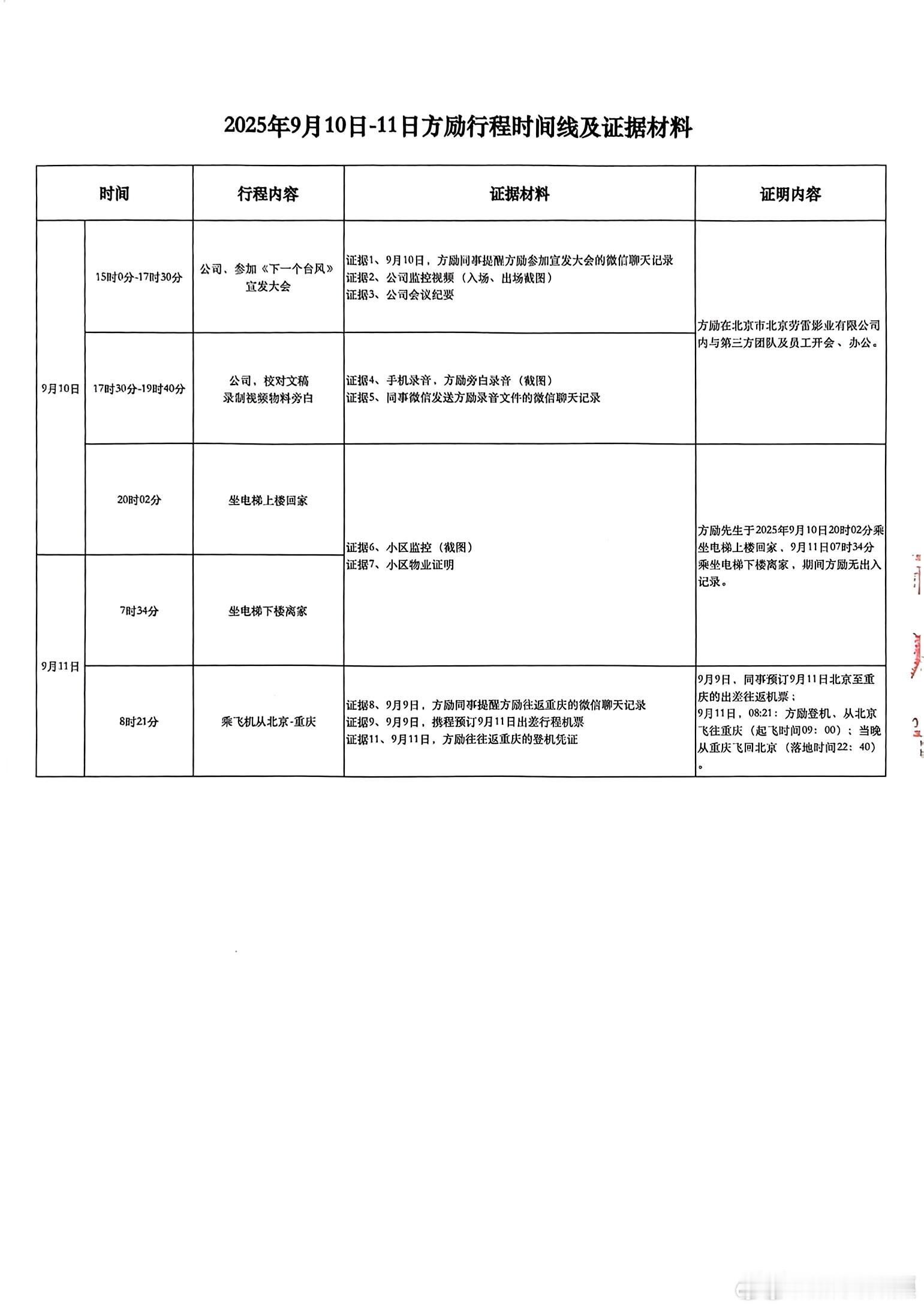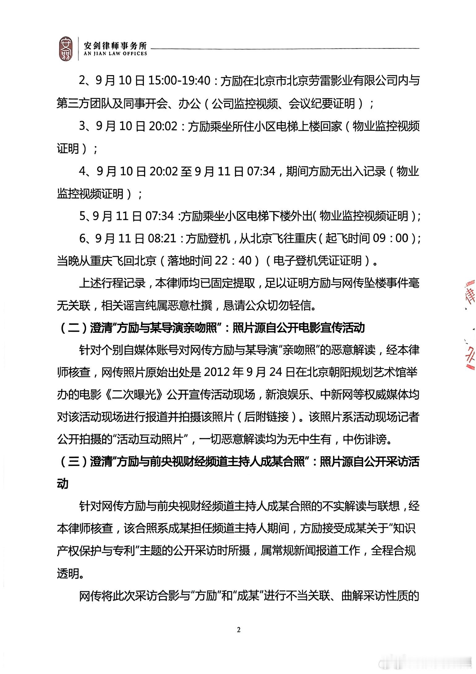 声明晒出方励行程与完整时间线,证明方励与“意外坠楼事件“毫无关联,表示相关谣言纯属恶意杜撰,并对“与某导演亲吻照”“与前央视财经频道主持人成某合照”两条网传内容进行了澄清。