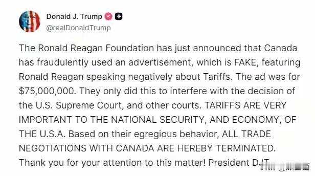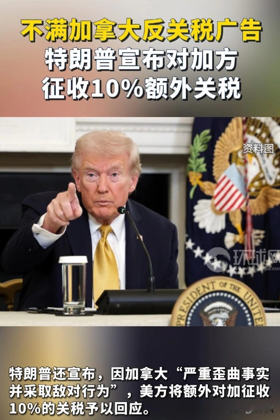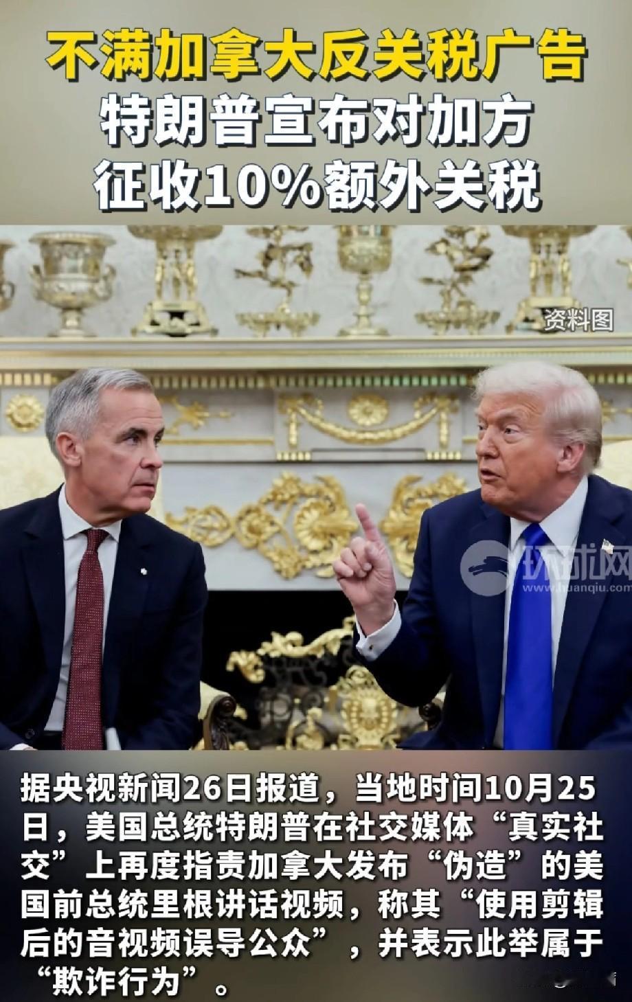 因一则旧视频,特朗普对加拿大“下狠手”:加征10%关税,终止所有谈判 当地时间10月25日,特朗普在社交平台上大发雷霆,对加拿大一通指责,称其发布“伪造”的前总统里根讲话视频,是“欺诈行径”,还直接宣布要对加拿大加征10%的额外关税。 此事要从两天前说起。10月23日晚,特朗普就曾发帖称,里根基金会刚发表声明,指出加拿大制作了一则虚假广告,其中剪辑了里根表达关税不利的内容。他当时便怒火中烧,称加拿大妄图借此干扰美国最高法院对关税问题的裁决,还直接宣布终止与加拿大的所有贸易谈判。 到了25日,特朗普继续抨击,称加拿大此举是“严重歪曲事实的敌对举动”。他还在帖子中附上了里根基金会的声明,声明中明确指出:加拿大安大略省政府使用里根1987年的讲话片段做广告,不仅曲解原意,且事先未获许可,纯属违规操作。 特朗普一直强调关税对美国安全和经济至关重要,所以此次动了真格。有趣的是,截至目前,加拿大方面尚未作出回应,不知是在研究对策还是另有考量。 要知道,美加本就是重要的贸易伙伴,此前也曾因关税产生过矛盾,加拿大此前甚至还对美国汽车加征25%的关税予以反击。此次特朗普因一则剪辑视频便如此“重拳出击”,不仅贸易谈判告吹,额外关税一加,两国贸易势必受到影响。 说到底,这表面上是为了“纠正虚假宣传”,实则仍是围绕关税政策的博弈。只是不知加拿大后续是否会反击,这10%的额外关税最终会由谁承担。你认为加拿大接下来会如何应对,美加这场贸易摩擦又会发展到何种程度? 美国特朗普关税 特朗普征加关税 特朗普增关税 特朗普关税方案