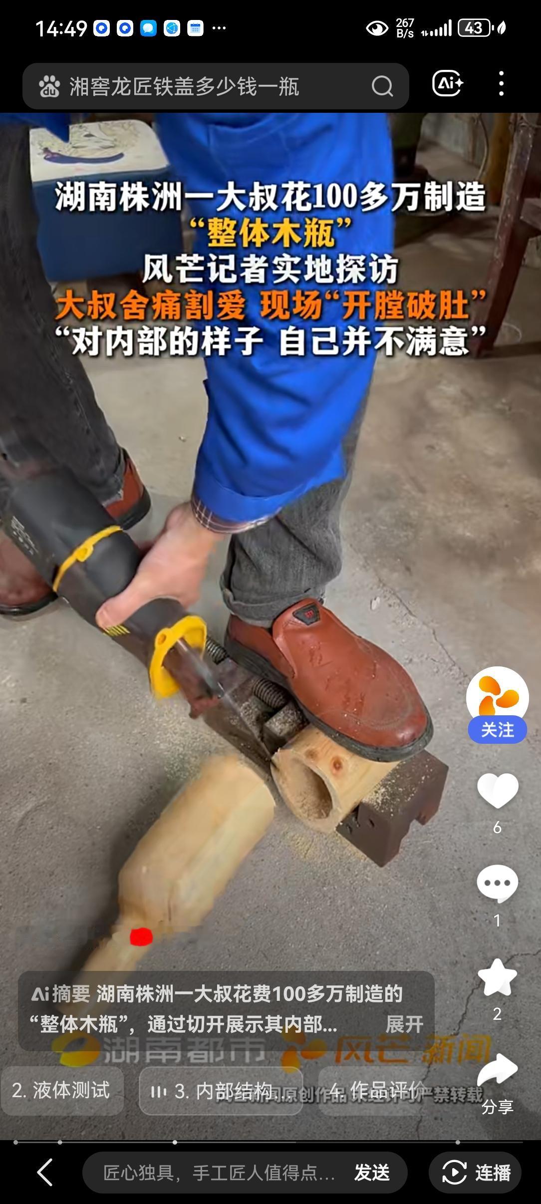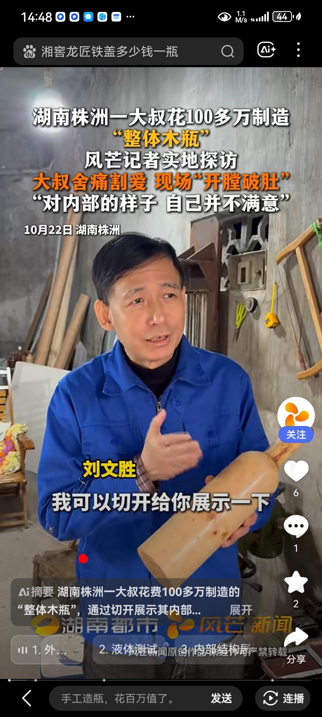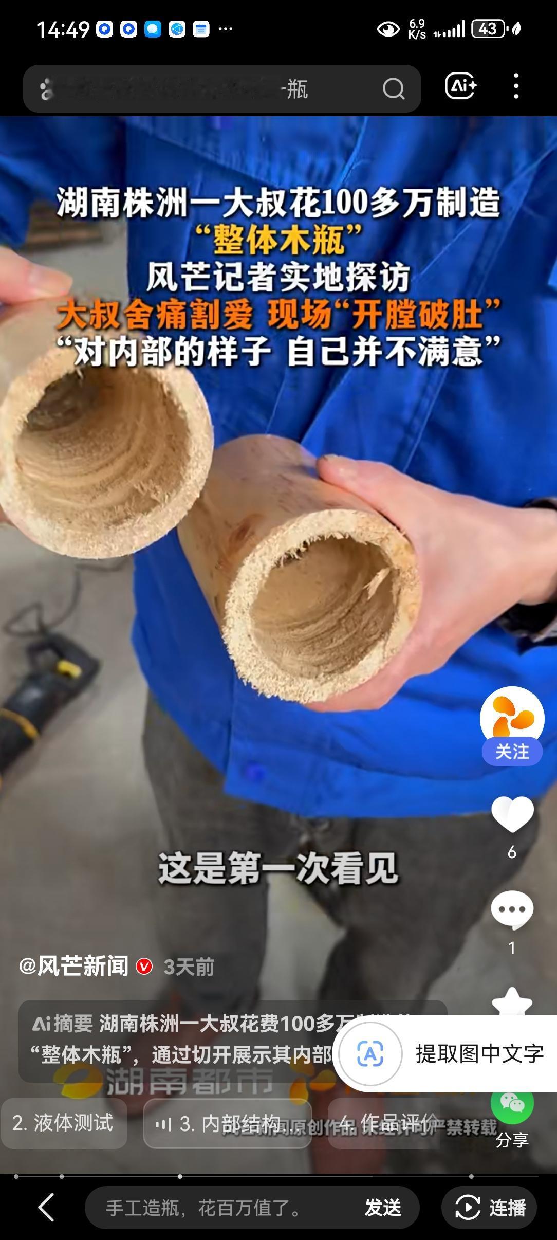 估计“木瓶哥”肠子都悔青了!三年熬出的整体木瓶,悬赏100万才一天,就被网友“时间轴”搞定了。 他闭关三年磨出的“整体木瓶”,自称无人能及,结果网友“时间轴”直接开直播,现场复刻了一个。 更绝的是,人家做的木瓶内壁,比木瓶哥的还要光滑,技术明显更胜一筹。 三年心血VS两天复刻,木瓶哥估计当场懵了,原来自己闷头钻研的“绝技”,在别人眼里根本不算事儿。 说到底不是技术难,是他太闭门造车了。练着“太极拳”觉得天下无敌,殊不知外面早就有人用“枪”了。 现在网友都在催他兑现100万,可看这架势,大概率是要耍赖说“开玩笑”的。 有意思的是,“时间轴”从头到尾没提要钱,就想提醒他:一山更比一山高,别把自己困在小圈子里。 你觉得,木瓶哥最后会认这个账吗?