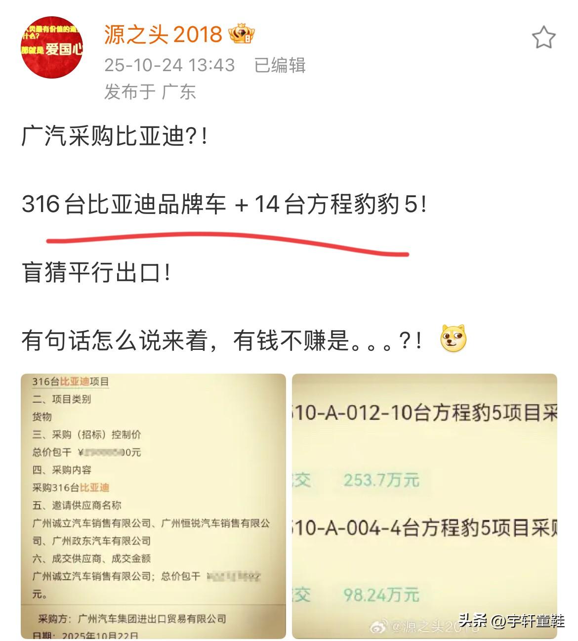 啥,广汽采购比亚迪?而且数量还不少(300台)? 一个造车的车企,他们买这么多比亚迪干嘛?是买进去贴牌出售?还是买进去做逆向开发?或是两者都存在 另外,我想问问,是不是所有的车企都是这样操作的?比亚迪到底买了友商多少车呢?[呲牙]
