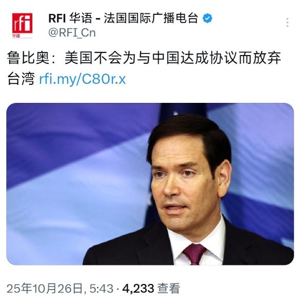 法媒今天(10月26日)报道:“鲁比奥:美国不会为与中国达成协议而放弃台湾。鲁比奥表示,外界的担忧‘没有根据’。‘如果有人担心我们为了达成一项贸易协议,或者换取某种优惠待遇而放弃台湾,那是不可能发生的’。” 法媒报道了美国参议员鲁比奥的最新言论,他表示,美国不会为了与中国达成协议而放弃台湾。 鲁比奥明确指出,外界对美国可能为经济或贸易利益牺牲台湾的担忧是“没有根据的”。 他强调,如果有人认为美国会为了换取某些经济利益或达成某项协议而放弃台湾,这是“不可能发生的”。 此番言论凸显了美国在台湾问题上的坚定立场,多年来,台湾一直是中美关系中的敏感话题。 虽然美国采取了“一个中国政策”,但在实际操作中,美国依然通过军事援助、经济合作等方式支持台湾,鲁比奥的声明显然是想打消外界对美国在未来可能向中国妥协的忧虑。 台湾不仅仅是一个地区问题,它背后牵涉到美国的地缘政治利益,对于美国来说,台湾是对中国崛起的重要战略制衡因素,因此,无论在什么情况下,放弃台湾显然不是美国的选项。 尽管美国和中国之间在贸易、科技、军事等多个领域存在竞争,但台湾问题始终是美国政府不能轻易妥协的核心议题。 鲁比奥的发言,正是重申了美国在这一问题上的立场,不容忽视。 对于这件事情,大家有什么看法?可以在评论区聊聊