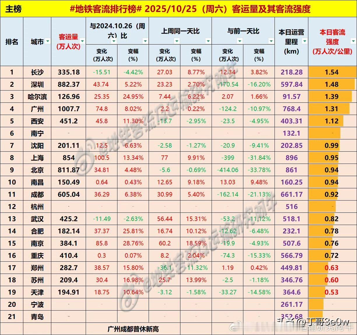 广州周六创新高,地铁客流量突破1007万人次[呲牙][呲牙][呲牙] 爆料 身边事 2025年10月25日 星期⑥ 全国重点城市轨道交通客流量排行榜: 广州:1007.70万广州地铁 深圳:882.37万深圳地铁 上海:854.00万 北京:881.87万 成都:605.04万 西安:451.20万西安身边事 杭州:420+万杭州身边事 武汉:425.20万武汉地铁 重庆:410.40万重庆身边事 南京:384.10万南京地铁 长沙:335.18万长沙身边事 郑州:282.70万 苏州:209.40万苏州身边事 沈阳:201.11万 天津:194.91万天津身边事 合肥:182.14万合肥爆料 青岛:150万+青岛身边事 南昌:150.49万 南宁:120万+ 哈尔滨126.96万哈尔滨爆料 宁波:100万+