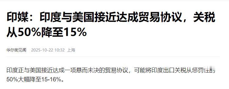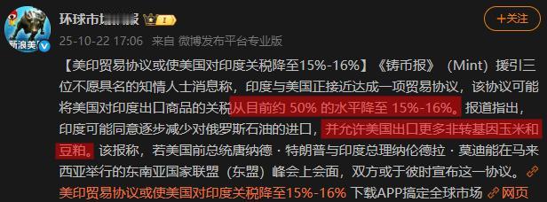 特朗普率先向印度让步?据印度媒体报道,美国将把对印关税从50%削减至15%,作为回报,莫迪政府将从美国购买非转基因大豆和玉米,以弥补在中国市场的损失。 其实,明眼人都能看出,这就是笔赤裸裸的利益交换,核心筹码就是美国的农产品和印度的市场大门,美国农业部的数据早摆着,大豆常年占其农产品出口总额的14%,2024年出口额更是高达245.8亿美元,但中国市场的订单正不断流向巴西、阿根廷,急得美国不得不往印度这类市场里“找补”。 而印度这边,恰好能拿农产品采购当敲门砖——毕竟自8月美国加征50%关税以来,印度对美出口已连跌4个月,纺织品、工程产品这些主力品类全遭重创,确实需要关税松绑喘口气。 莫迪政府答应买的非转基因大豆和玉米,可不是随便给的甜头,印度本土一直禁止转基因玉米进口,美国玉米里94%都是转基因品种,这道门槛卡了美方好几年,现在松口允许非转基因产品进入,等于给美国农产品开了个关键缺口,而且不止玉米,连非转基因豆粕的进口磋商也在推进中。 至于“弥补在中国市场的损失”,虽说具体数据没明说,但结合中国近年从印度进口农产品的波动来看,这更像是印度给自己找的台阶,毕竟此前印度棉花、碎米等农产品在国际市场的销路并不顺畅,能借采购换关税减免,反倒成了笔划算买卖。 而且,有意思的是这俩国家前阵子还闹得脸红脖子粗。美国商务部长9月刚放话要“修理”印度,印度街头就出现了骂特朗普背后捅刀子,陆军更是暗示两国关系差到了1971年的水平。 莫迪本人一边在社交媒体上跟特朗普互称“朋友”,一边呼吁民众抵制外国商品,活像场荒诞的双簧戏,如今特朗普主动松口降关税,说穿了还是自家农民的选票要紧,大豆可是美国农业的命脉,要是再打不开新市场,2024年贸易逆差457亿美元的窟窿只会更大。 而印度这边的态度也透着精明,商工部长高耶尔前阵子还硬气宣称“印度绝不会向任何人屈服”,转头就跟美国谈得火热,甚至同意逐步减少俄罗斯石油进口来换关税优惠,这种嘴硬心软说白了是算清了账,农业虽然是印度的敏感领域,70%农村家庭靠它吃饭,但开放非转基因农产品既能换关税减免,又不会直接冲击本土小农,毕竟印度缺的是高品阶农产品,跟本土中低等级作物形成不了直接竞争。 不过这场交易也藏着不少猫腻,美国只肯把关税降到15%左右,没彻底清零,显然是留了后手;印度也没松口乳制品关税,对美国奶酪这类产品依旧严防死守,毕竟那才是真能砸了本土奶农饭碗的雷,更值得琢磨的是特朗普前脚说莫迪承诺“停止购买俄罗斯石油”,后脚就被印度外交部悄悄否认,这种互相放风的操作,倒像是给协议留了缓冲空间。 说到底,这场“让步”不过是美印各自算清利益账后的妥协,特朗普需要农产品出口数据救场,莫迪需要关税减免稳住出口,所谓的伙伴关系从来都是利益搭台,只是这出戏能不能唱到底还不好说。 现在印度农业专家已经在担心,扩大豆粕进口会压低本土价格,冲击种植积极性;美国那边要是农民没得到实利,特朗普的胡萝卜随时可能变回大棒,毕竟从22公里欢迎红毯到互相加税,再到如今的关税换农产品,这俩国家的关系从来都是“没有永恒的朋友,只有永恒的算计”。