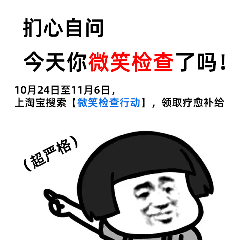 当代年轻人的生存密码:用微笑掩盖“精神内耗”,用微笑应对“无效社交”!明明心里在抗议,嘴角却自动上扬——比泪失禁更尴尬的是笑失禁即日起至11.6上淘宝搜【微笑检查行动】,抽取疗愈补给,一起来笑着摆烂,快乐躺平~天猫发起微笑检查行动 ​​​