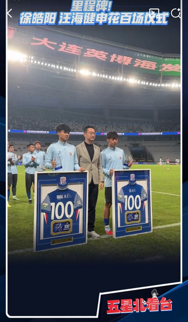 据“五星体育”报道,比赛开始前申花为汪海健、徐皓阳举行百场仪式,两人获赠纪念球衣和纪念品。