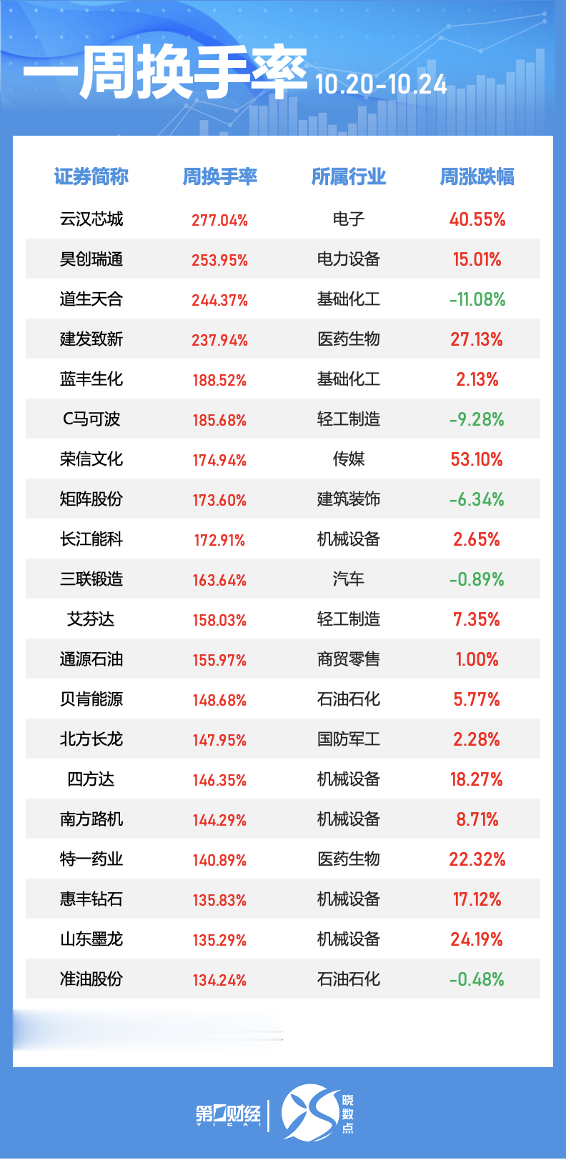 本周五个交易日中有51只个股换手率超过100%。其中,云汉芯城排名居首,周换手率达到277.04%;此外,昊创瑞通、道生天合、建发致新本周换手率均超200%。