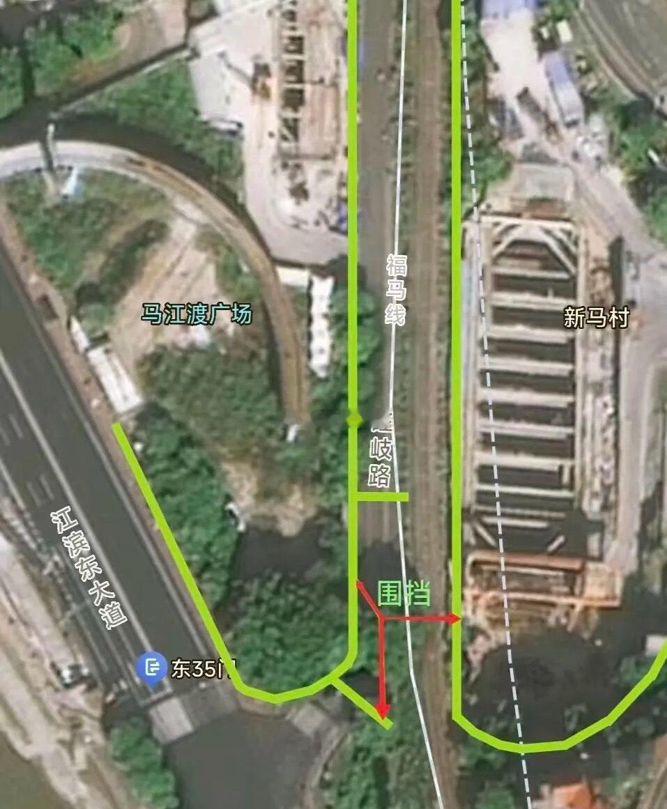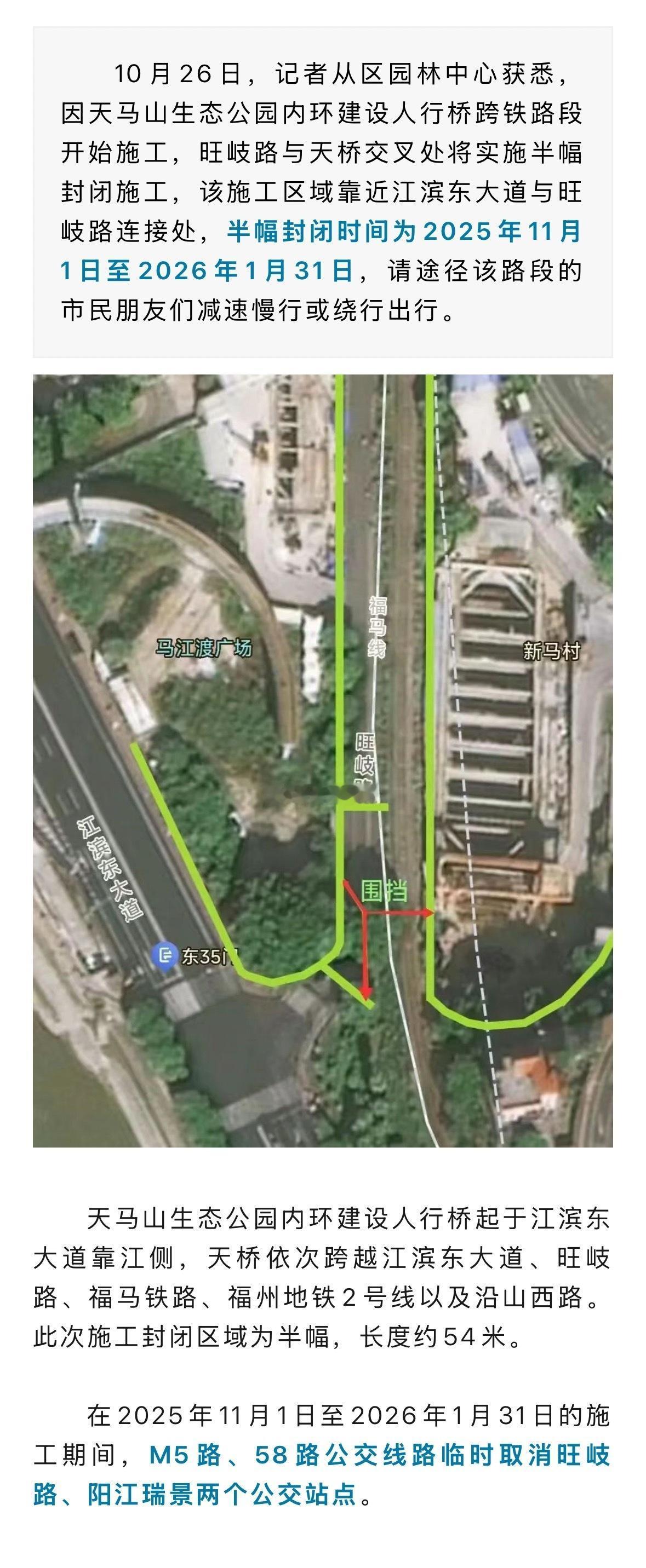 福州马尾东江滨 天马山生态公园内环建设人行桥开始施工 天桥依次跨越江滨东大道、旺岐路、福马铁路、福州地铁2号线以及沿山西路。此次施工封闭区域为半幅,长度约54米。