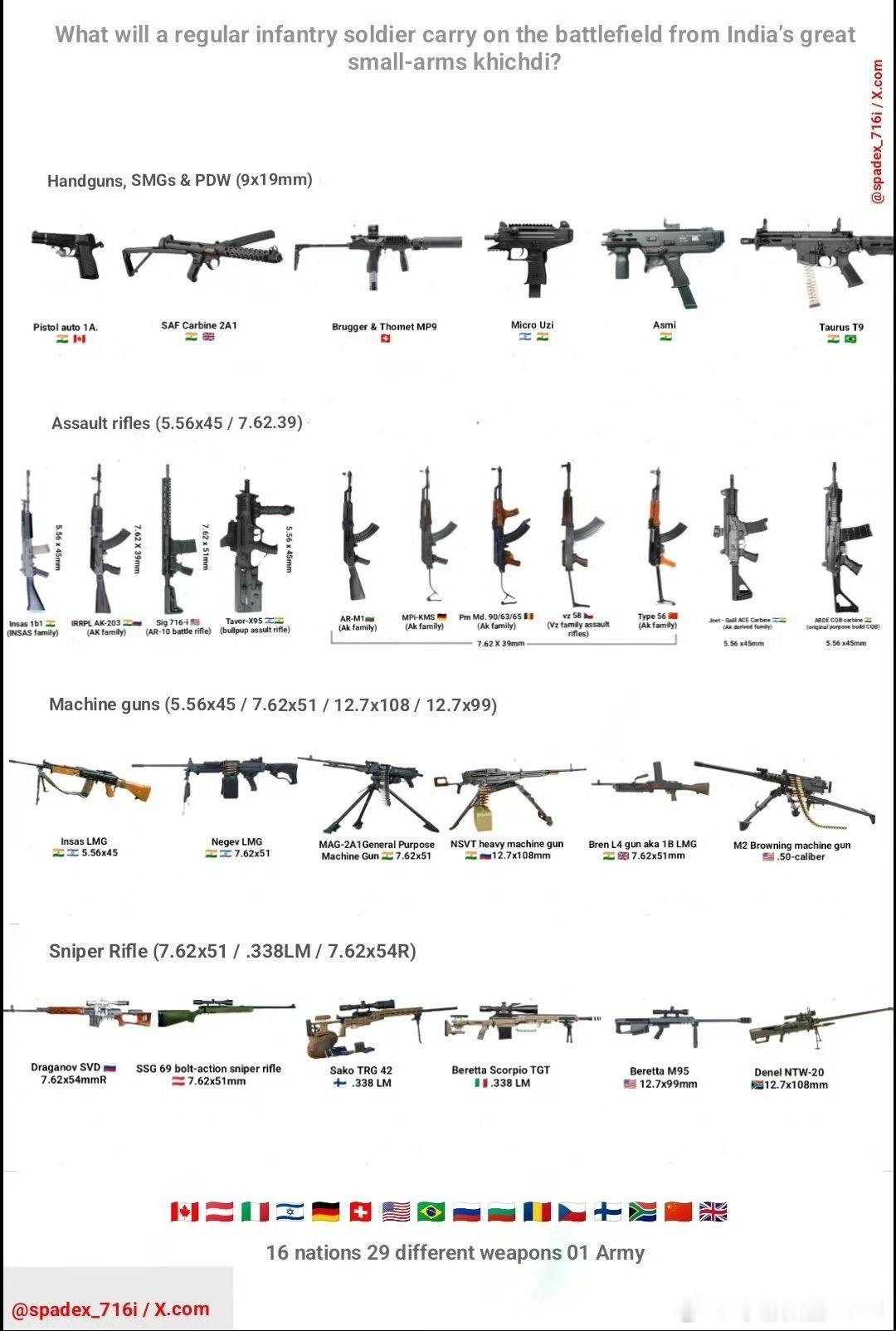 印度陆军及准军事部队装备的步枪至少来自16个国家,29种不同的武器,10种不同的口径。