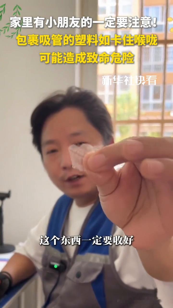 家里有小朋友的一定要注意!包裹吸管的塑料如卡住喉咙可能造成致命危险。 新华社快看。 家里有小朋友的这个东西一定要收好,如果不小心被小朋友卡在喉咙里,海姆立克都救不了。它就是饮料牛奶后面吸管外面这层保护膜,它又薄又粘,小朋友去拆吸管的时候都喜欢用嘴去咬,如果不小心咽下去卡在喉咙里是非常危险的。家里边如果有这个吸管的一定要放好,放在小朋友拿不到的地方。