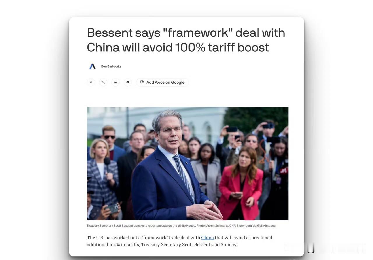 贝森特称与中国达成“框架”协议将避免100%的关税上调 贝森特周日表示,美国已与中国达成“框架”贸易协议,该协议将避免中国威胁加征 100% 的关税。这一消息将极大地缓解金融市场和企业的担忧,金融市场担心贸易战升级,企业担心成本将出现难以想象的飙升。 贝森特说:“我认为我们将能够讨论如何帮助我们控制这场可怕的芬太尼危机。我认为我们将能够讨论为美国农民大量采购大豆和农产品。我认为我们将能够讨论更加平衡的贸易。”