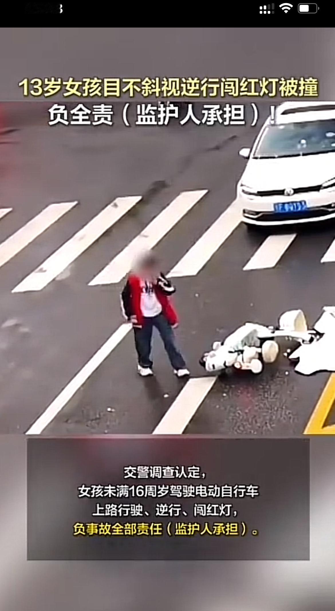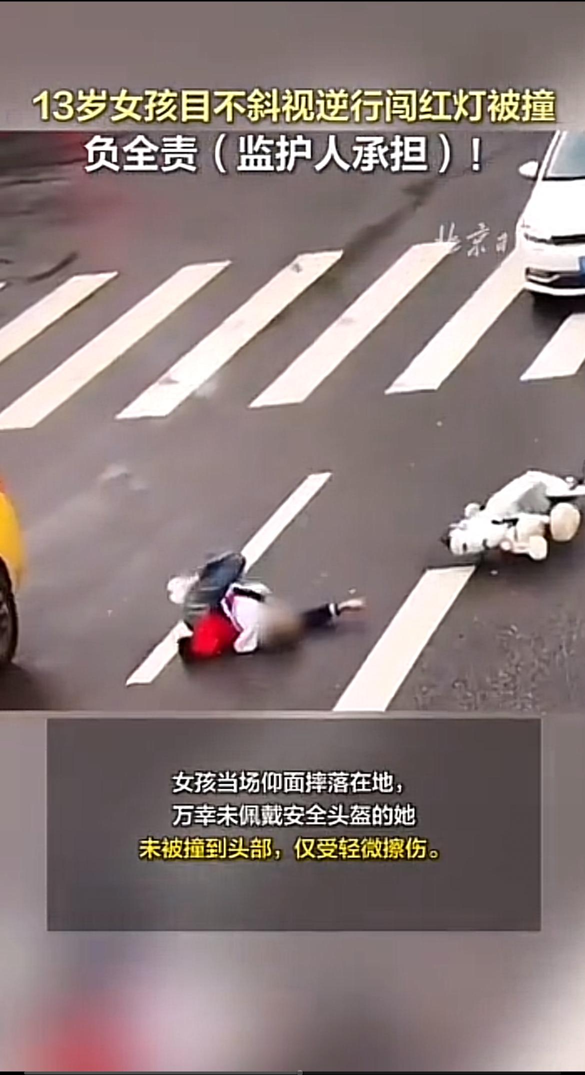 2025年10月1日,湖北襄阳发生了一件让人后怕的事。13岁的小丽骑电动自行车逆行到路口,无视红灯还加速,一头撞上正常行驶的出租车,当场仰面摔倒。万幸她没被撞到头部,仅受轻微擦伤。交警认定,小丽未满16岁骑车、逆行且闯红灯,负事故全责,由监护人承担。 这件事给大家提了个醒,安全头盔有时候真能救命。而且家长一定要加强对孩子的监管,教育他们遵守交规。孩子达到骑行年龄上路,也得有安全和守法意识,可别再干这种危险事儿了。
