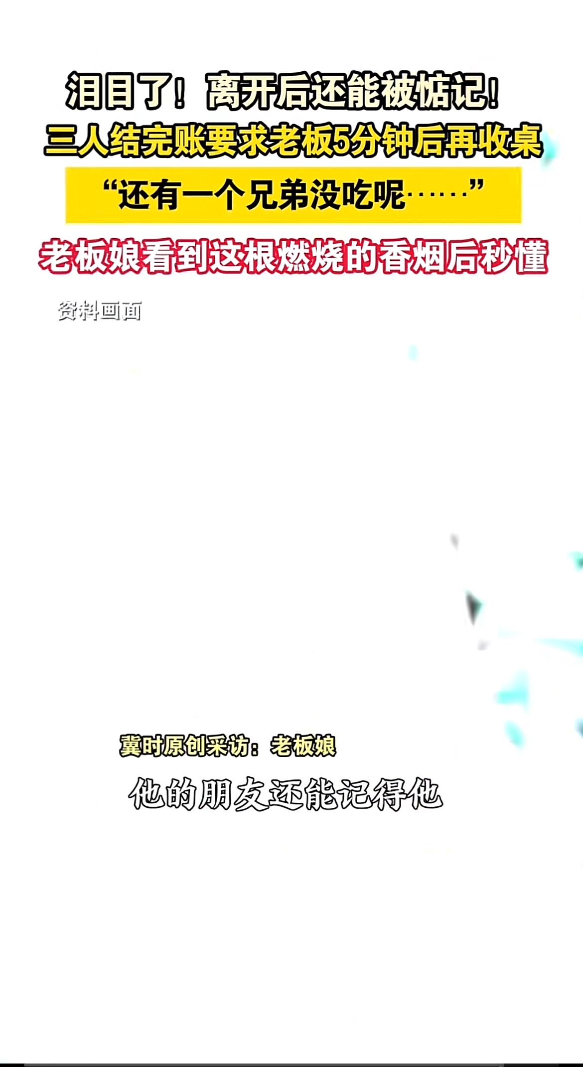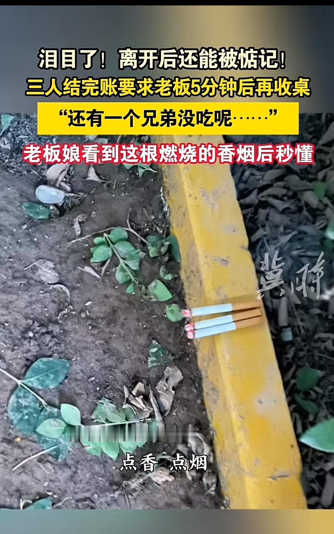 在江苏泰州一家小饭店,有暖心一幕。三个年轻人饭后结账,却让老板娘别收拾桌子,说兄弟马上就到。时间过去,座位依旧空着。直到老板娘看到那根静静燃烧的香烟,瞬间懂了一切。 原来他们要等的兄弟,几年前因意外早逝。每次聚餐,桌上都会摆四副碗筷,给空碗夹菜,还会为兄弟点烟。这根烟成了连接两个世界的纽带,承载着无尽思念。老板娘起初只当平常等待,而那根烟像钥匙,打开了这份超越生死的情谊之门。这份心意令人动容,愿这份温暖能一直延续。