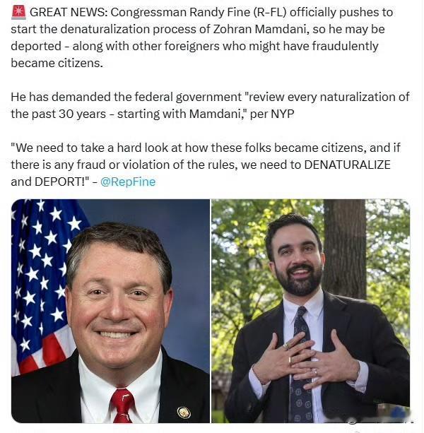 佛罗里达州共和党众议员兰迪·范恩正式推动启动对佐兰·曼达尼的“剥夺公民身份程序”,以便将他与其他可能通过欺诈手段获得公民身份的外国人一同驱逐出境。 他要求联邦政府“审查过去30年的所有入籍案例——从曼达尼开始”。 范恩表示:“我们必须认真审查这些人是如何获得公民身份的,如果发现任何欺诈或违规行为,就必须剥夺公民身份并驱逐出境!”