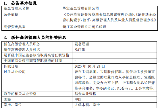 近日,华宝基金管理有限公司发布高管变更公告,宣布任命欧江洪为公司副总经理,任职日期为2025年10月24日。