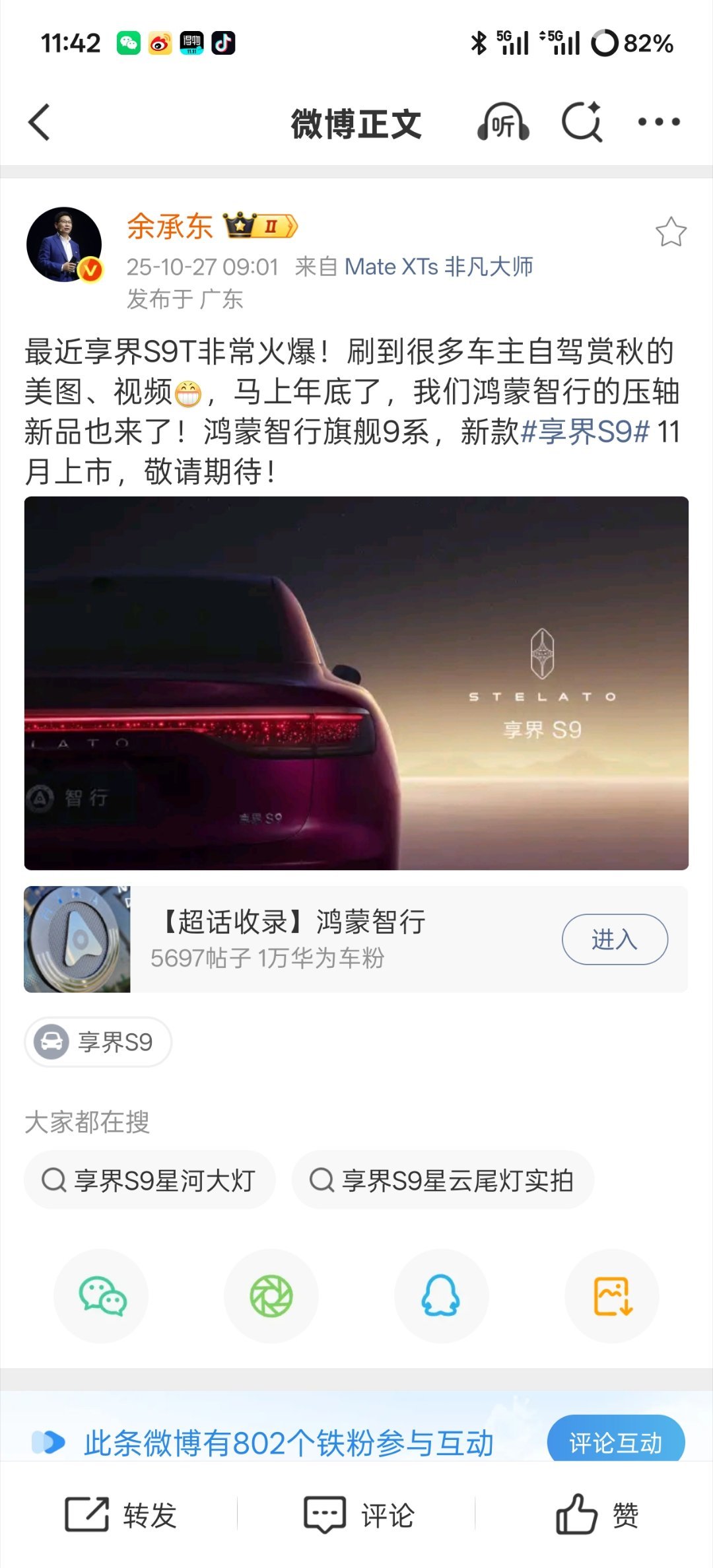 华为余承东在微博宣布:鸿蒙智行的“压轴新品”旗舰 9 系 —— 新款享界 S9 将于 11 月上市。
