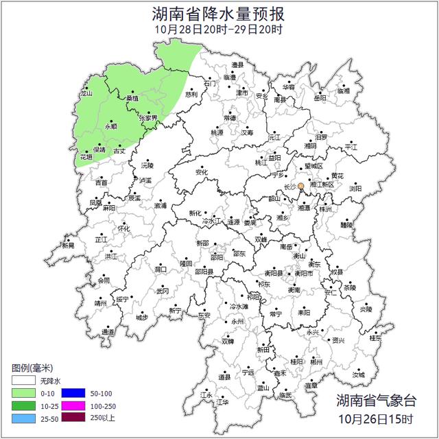 28日晚上至29日白天,湘西北多云转小雨,早晨有雾,其他地区晴天到多云;北风2~3级;最低气温湘西10~12℃,其他地区12~15℃,最高气温湘南25~28℃,其他地区23~25℃。