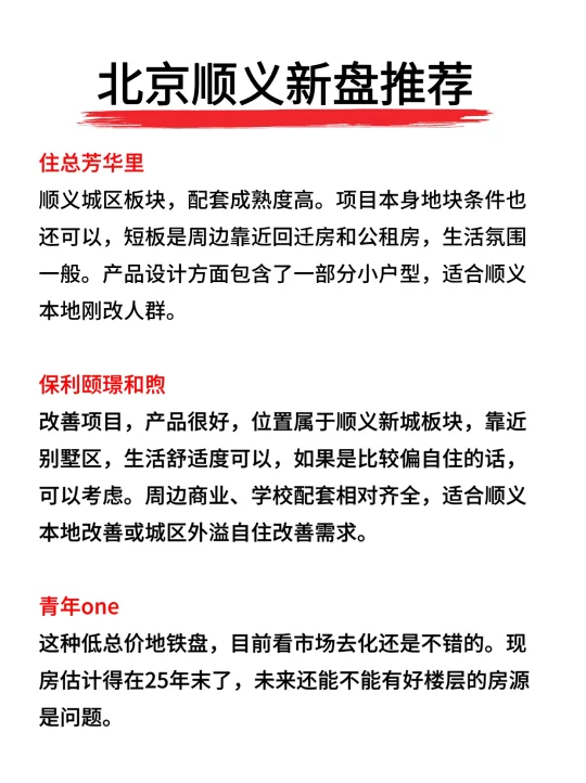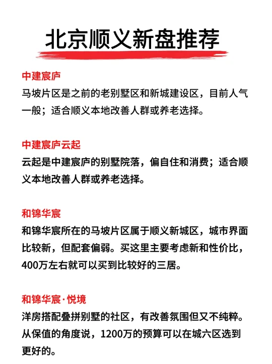改善项目,产品很好,位置属于顺义新城板块,靠近别墅区,生活舒适度可以,如果是比较偏自住的话,可以考虑。周边商业、学校配套相对齐全,适合顺义本地改善或城区外溢自住改善需求。