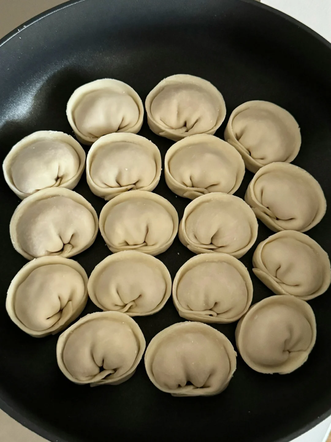 4️⃣ 热锅冷油将饺子煎到底部金黄,加入淀粉水没过饺子,盖上盖子焖到水分蒸发,底部煎得脆脆的就可以啦