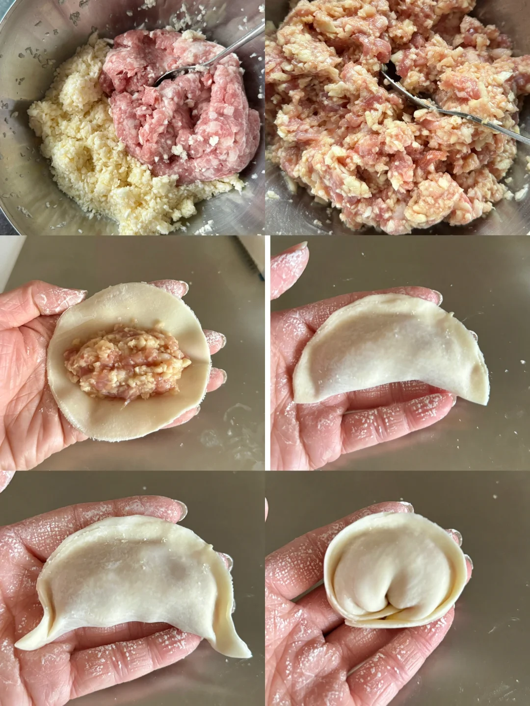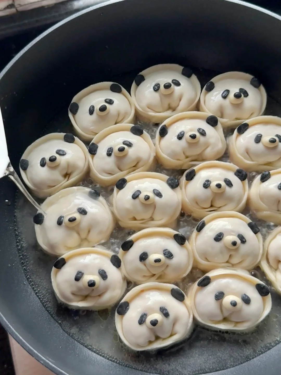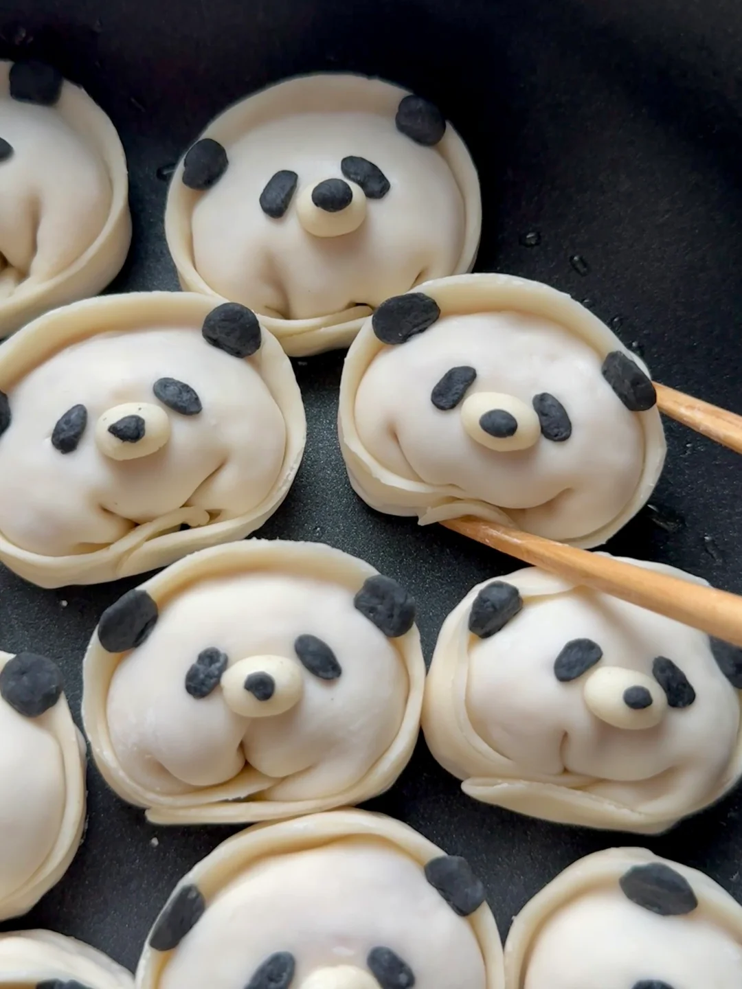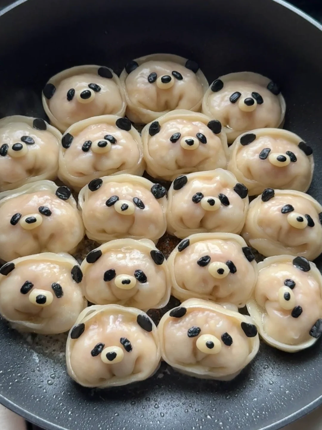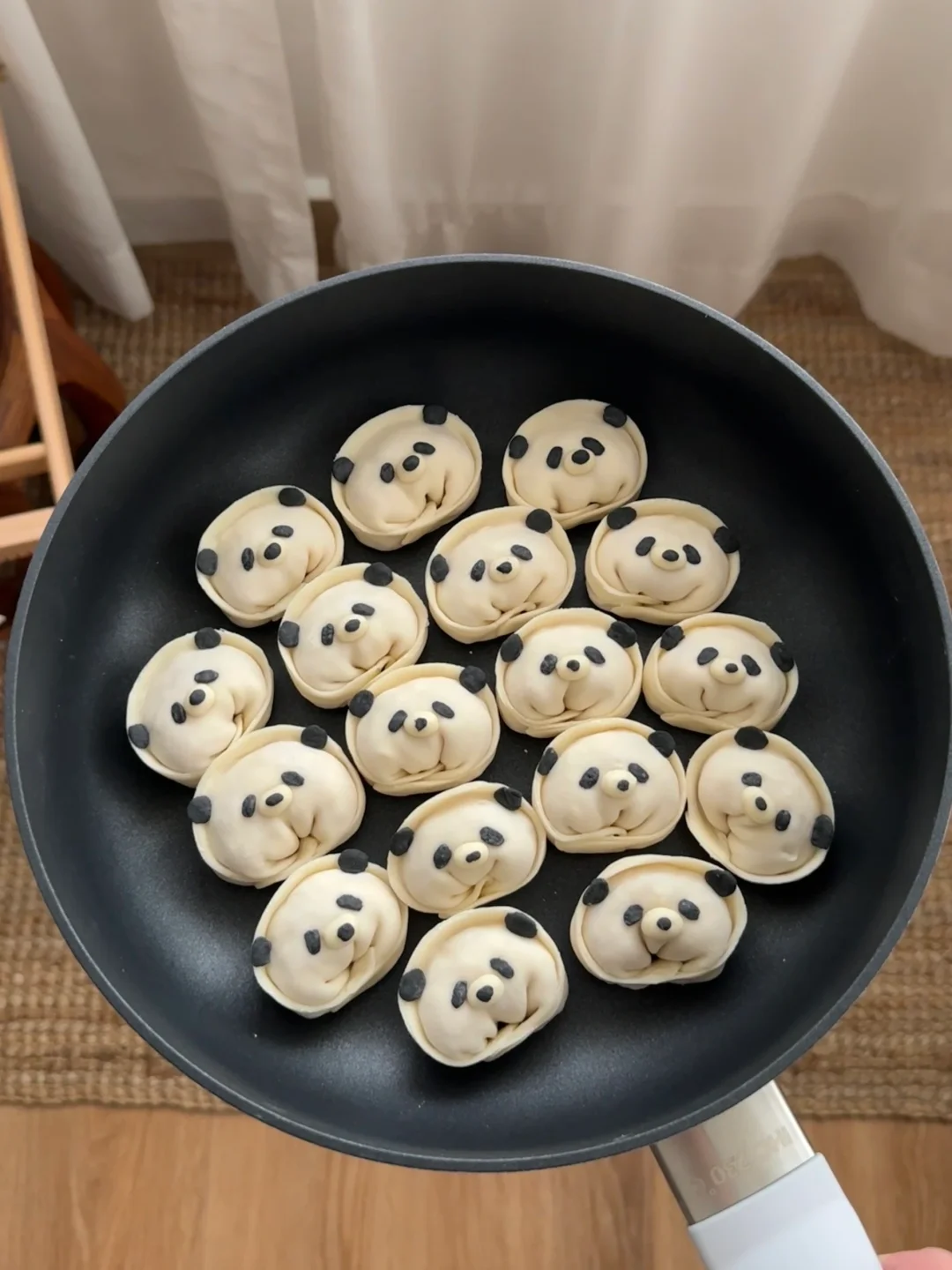 3️⃣饺子皮包入馅料,包成元宝的形状,表面沾水,用面团捏出熊猫表情
