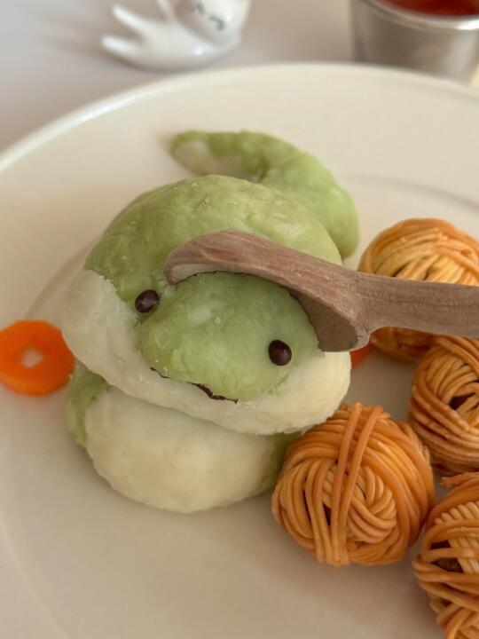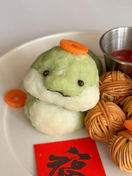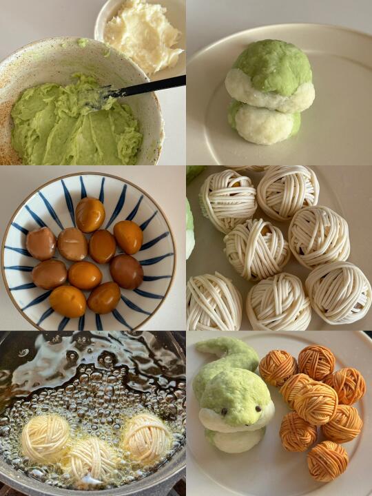 1️⃣将山药去皮切块上锅蒸熟,蒸熟的淮山加入适量牛奶和白糖捣成泥,分一部分出来加入斑斓粉调色,然后再捏出小蛇的样子,用巧克力画上眼睛