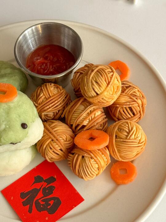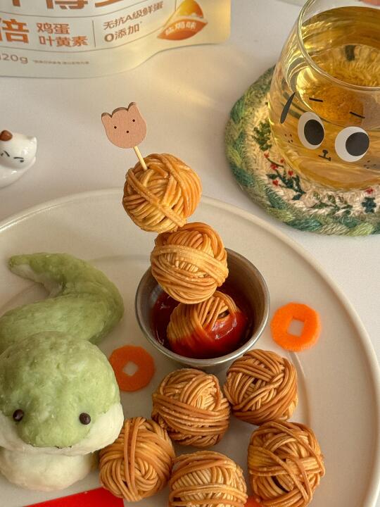 2️⃣用面条把鹌鹑蛋给不规则的缠绕起来,锅中下油,油热后将包裹好的鹌鹑蛋放入油锅中小火炸至金黄,捞出后再复炸一次即可,出锅后可蘸番茄酱或者撒椒盐