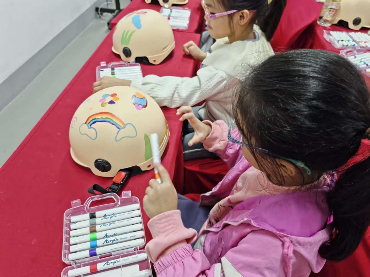 随后的彩绘DIY环节将活动推向高潮。孩子们化身“小小设计师”,在纯白色的头盔上尽情挥洒创意。他们或用画笔勾勒出五彩斑斓的图案,或认真写下“安全出行”的提示标语,将交通安全意识融入一幅幅充满童趣的作品中。一顶顶独一无二的个性化安全头盔在孩子们手中诞生,原本普通的防护用具变成了承载着安全理念与艺术想象的“守护盔”。