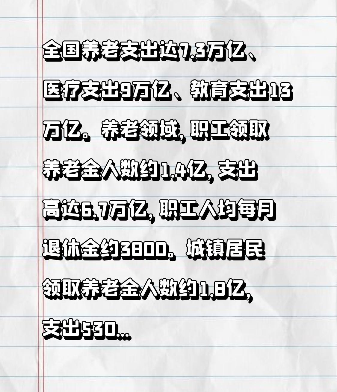 全国养老支出达7.3万亿、医疗支出9万亿、教育支出13万亿。 养老领域,职工领取